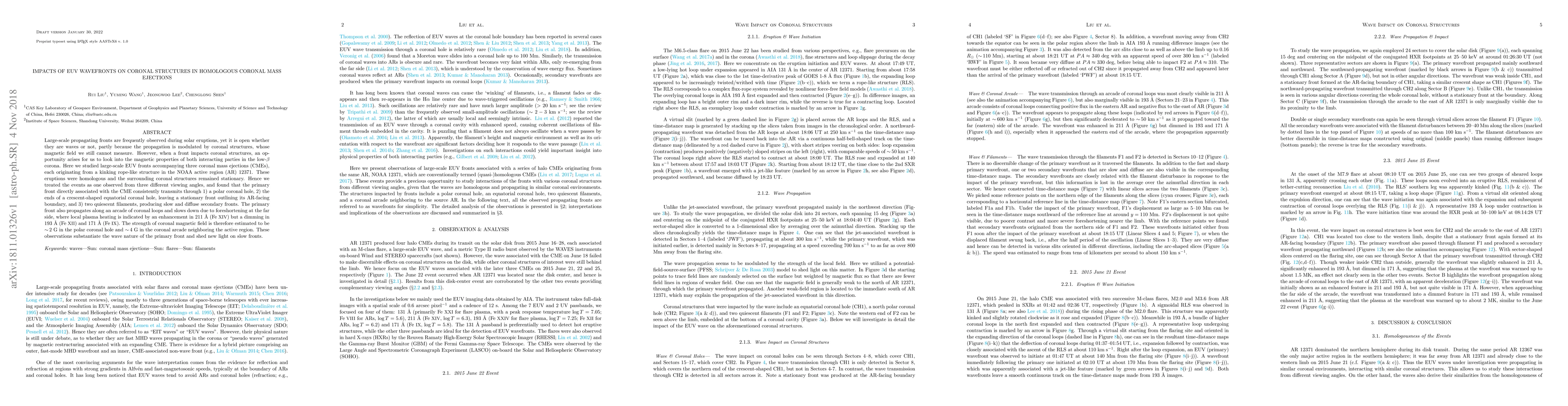 Large-scale propagating fronts are frequently observed during solar eruptions, yet it is open whether they are waves or not, partly because the propagation is modulated by coronal structures, whose magnetic field we still cannot measure. However, when a front impacts coronal structures, an opportunity arises for us to look into the magnetic properties of both interacting parties in the low-$\beta$ corona. Here we studied large-scale EUV fronts accompanying three coronal mass ejections (CMEs), each originating from a kinking rope-like structure in the NOAA active region (AR) 12371. These eruptions were homologous and the surrounding coronal structures remained stationary. Hence we treated the events as one observed from three different viewing angles, and found that the primary front directly associated with the CME consistently transmits through 1) a polar coronal hole, 2) the ends of a crescent-shaped equatorial coronal hole, leaving a stationary front outlining its AR-facing boundary, and 3) two quiescent filaments, producing slow and diffuse secondary fronts. The primary front also propagates along an arcade of coronal loops and slows down due to foreshortening at the far side, where local plasma heating is indicated by an enhancement in 211 {\AA} (Fe XIV) but a dimming in 193 {\AA} (Fe XII) and 171 {\AA} (Fe IX). The strength of coronal magnetic field is therefore estimated to be $\sim\,$2 G in the polar coronal hole and $\sim\,$4 G in the coronal arcade neighboring the active region. These observations substantiate the wave nature of the primary front and shed new light on slow fronts.