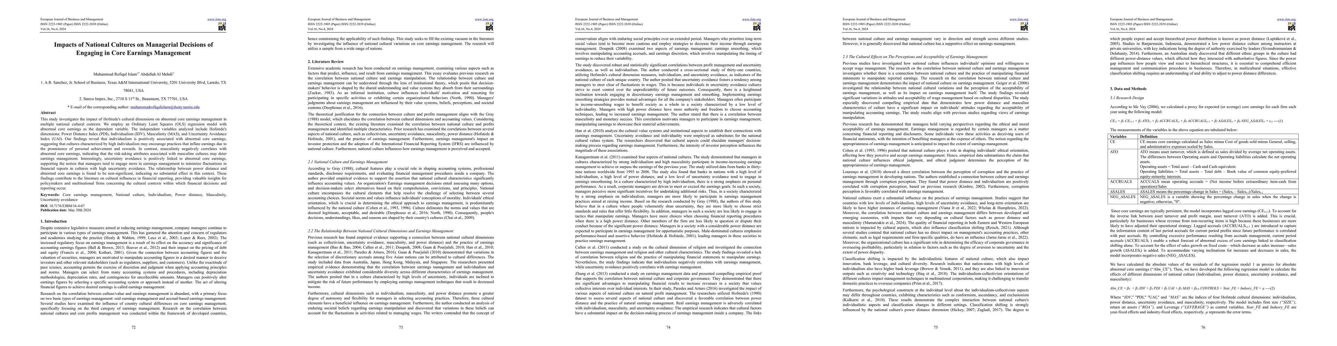 This study examines how Hofstede's cultural dimensions influence managerial decisions on abnormal core earnings management, finding that individualism and uncertainty avoidance are positively linked, while masculinity has a negative correlation. These insights highlight cultural influences on financial reporting practices.