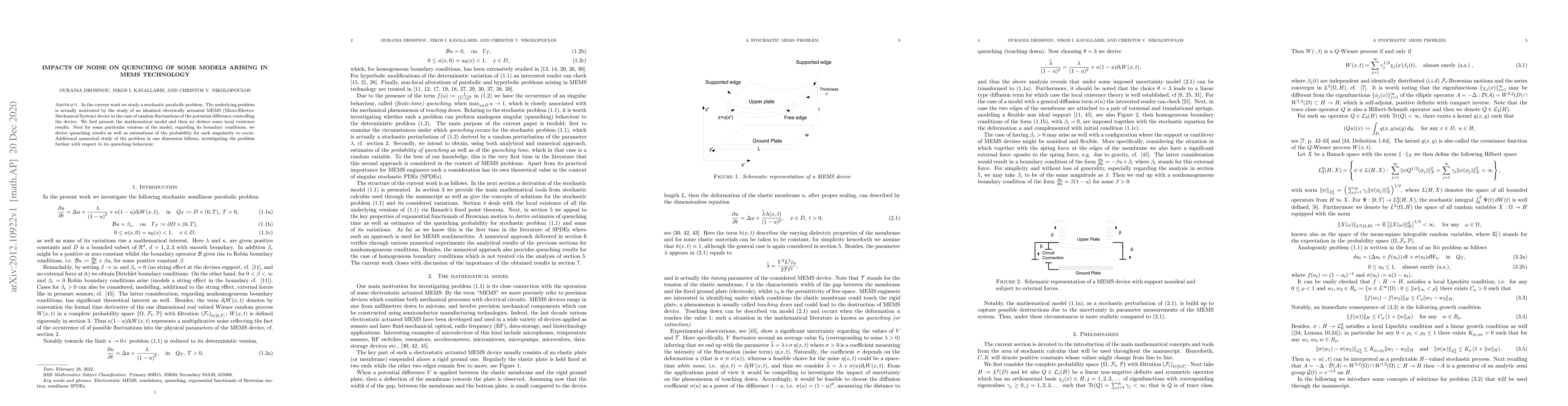 In the current work we study a stochastic parabolic problem. The underlying problem is actually motivated by the study of an idealized electrically actuated MEMS (Micro-Electro-Mechanical System) device in the case of random fluctuations of the potential difference controlling the device. We first present the mathematical model and then we deduce some local existence results. Next for some particular versions of the model, regarding its boundary conditions, we derive quenching results as well as estimations of the probability for such singularity to occur. Additional numerical study of the problem in one dimension follows, investigating the problem further with respect to its quenching behaviour.