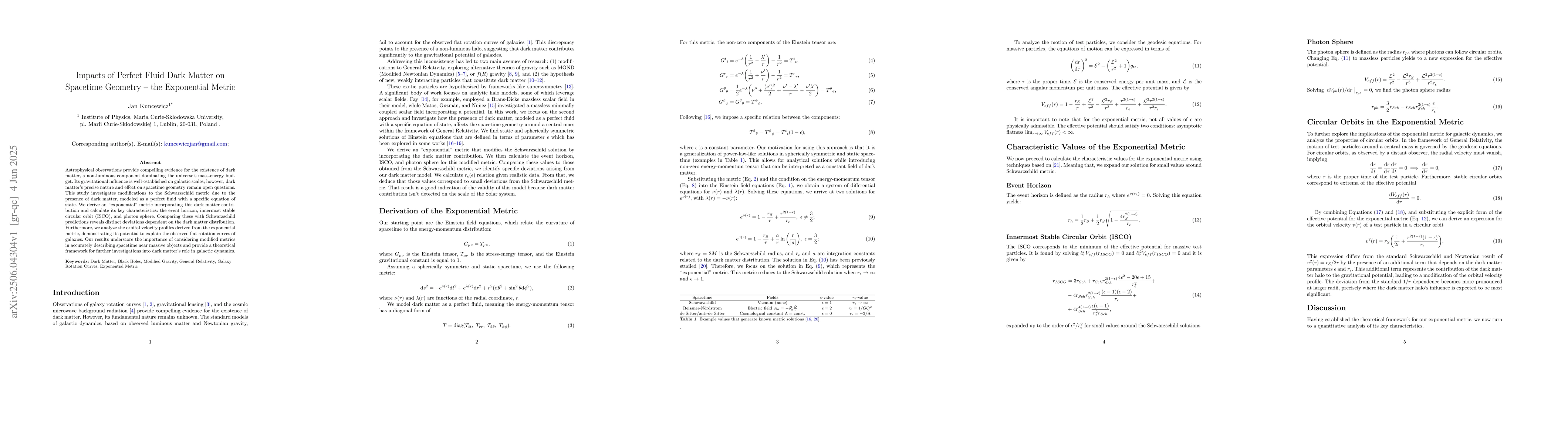 Astrophysical observations provide compelling evidence for the existence of dark matter, a non-luminous component dominating the universe's mass-energy budget. Its gravitational influence is well-established on galactic scales; however, dark matter's precise nature and effect on spacetime geometry remain open questions. This study investigates modifications to the Schwarzschild metric due to the presence of dark matter, modeled as a perfect fluid with a specific equation of state. We derive an "exponential" metric incorporating this dark matter contribution and calculate its key characteristics: the event horizon, innermost stable circular orbit (ISCO), and photon sphere. Comparing these with Schwarzschild predictions reveals distinct deviations dependent on the dark matter distribution. Furthermore, we analyze the orbital velocity profiles derived from the exponential metric, demonstrating its potential to explain the observed flat rotation curves of galaxies. Our results underscore the importance of considering modified metrics in accurately describing spacetime near massive objects and provide a theoretical framework for further investigations into dark matter's role in galactic dynamics.