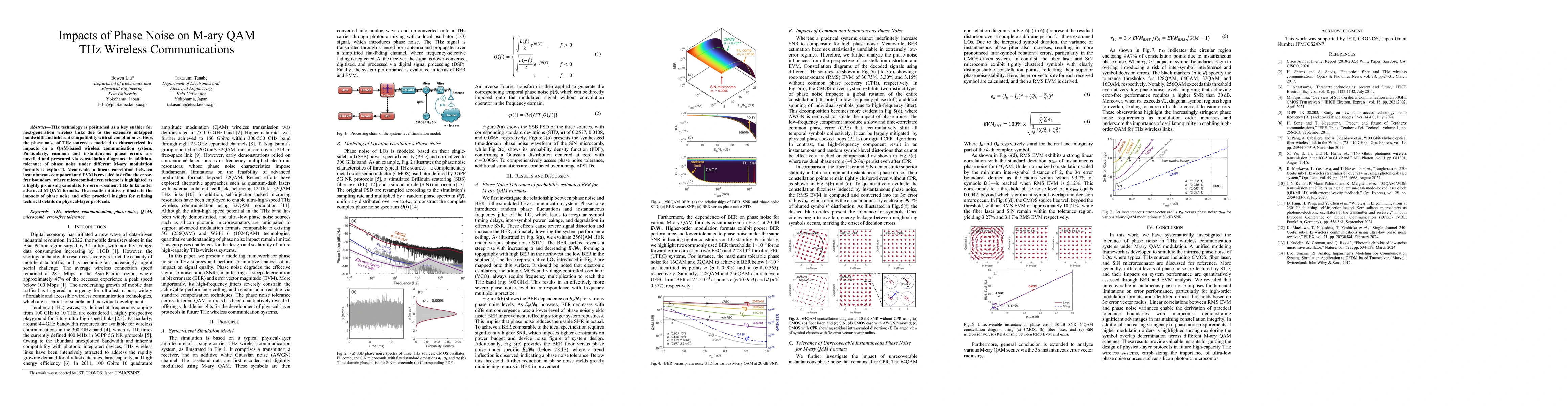 THz technology is positioned as a key enabler for next-generation wireless links due to the extensive untapped bandwidth and inherent compatibility with silicon photonics. Here, the phase noise of THz sources is modeled to characterized its impacts on a QAM-based wireless communication system. Particularly, common and instantaneous phase errors are unveiled and presented via constellation diagrams. In addition, tolerance of phase noise under different M-ary modulation formats is explored. Meanwhile, a linear correlation between instantaneous component and EVM is revealed to define the error-free boundary, where microcomb-driven scheme is highlighted as a highly promising candidate for error-resilient THz links under advanced M-QAM formats. The results intuitively illustrate the impacts of phase noise and offer practical insights for refining technical details on physical-layer protocols.
