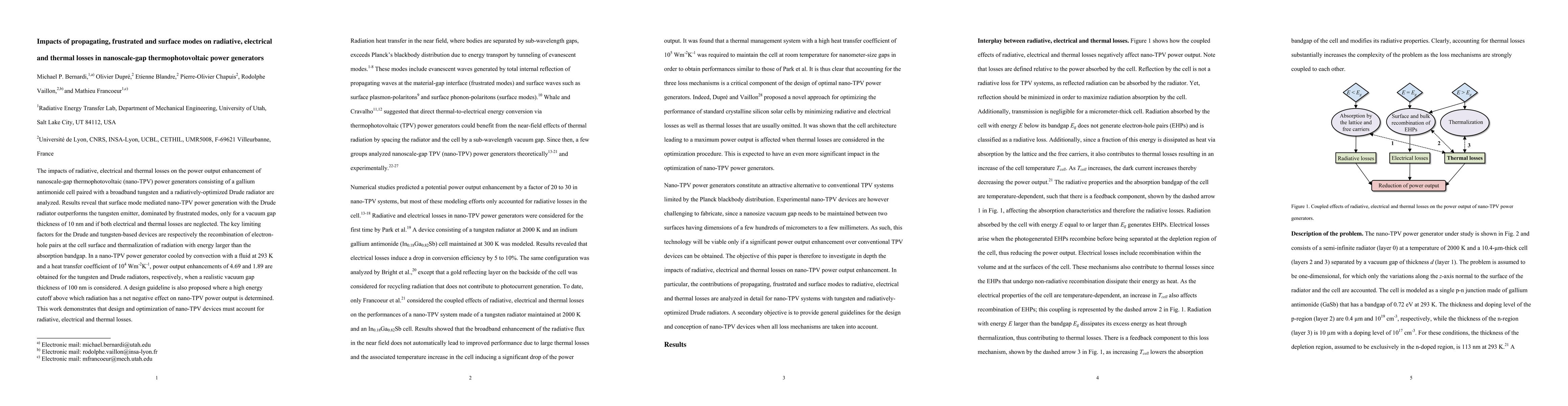 The paper presents a detailed analysis of radiative, electrical, and thermal losses in nano-TPV power generators, providing insights into the performance limitations and potential improvements.