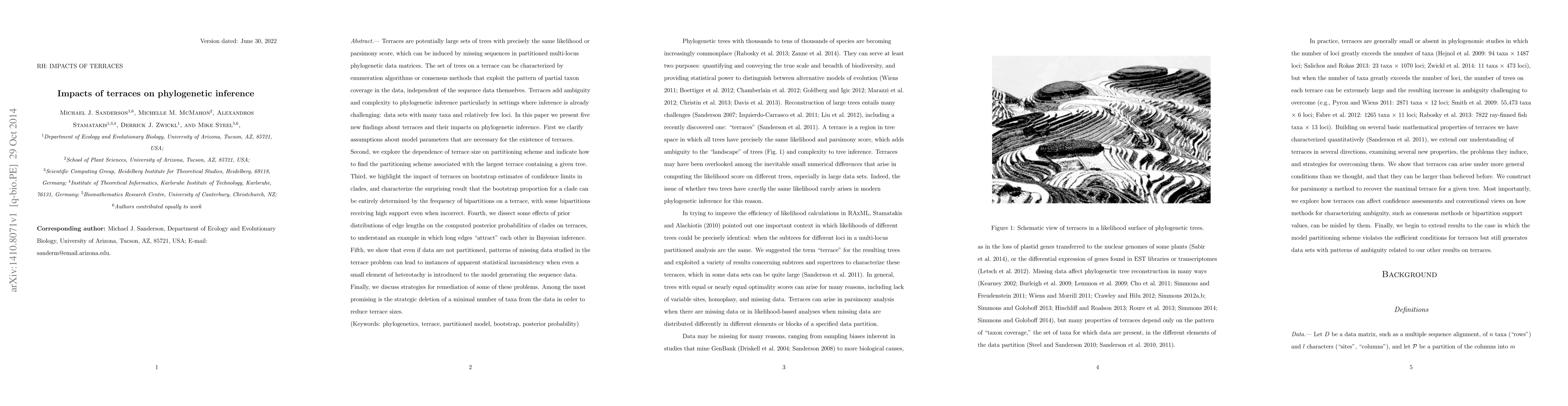 This research identifies five key findings about terraces in phylogenetic inference. Terraces, caused by missing sequences, introduce ambiguity and complexity, especially in large datasets with few loci. The study clarifies terrace-forming conditions, their size dependency on partitioning, impact on bootstrap confidence estimates, effects of edge length priors, and potential for statistical inconsistency even without partitioning. It concludes with strategies for remediation.