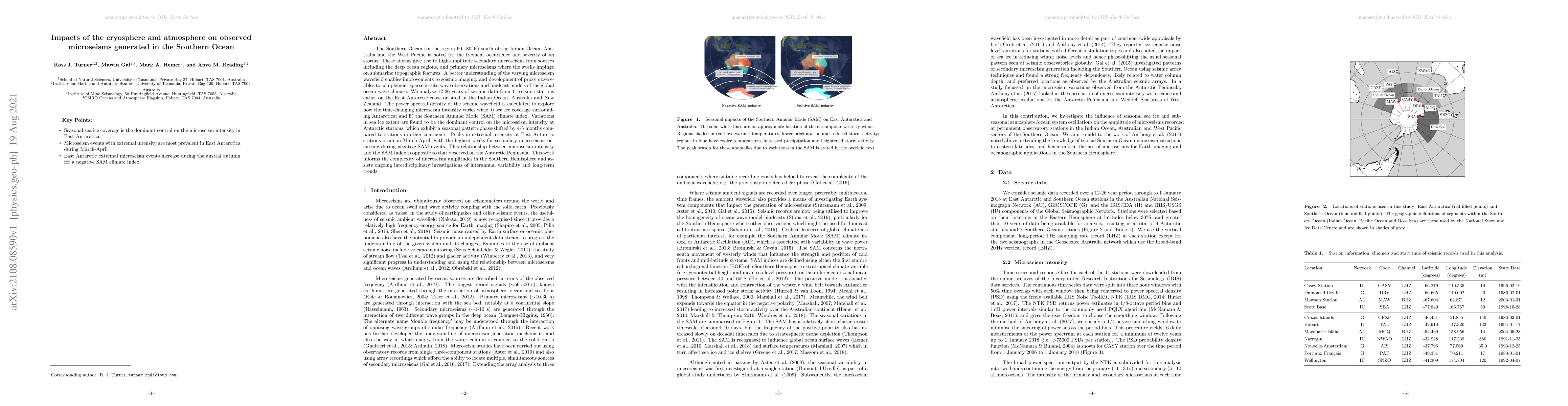 The Southern Ocean (in the region 60-180$^\circ$E) south of the Indian Ocean, Australia, and the West Pacific is noted for the frequent occurrence and severity of its storms. These storms give rise to high-amplitude secondary microseisms from sources, including the deep ocean regions, and primary microseisms where the swells impinge on submarine topographic features. A better understanding of the varying microseism wavefield enables improvements to seismic imaging and development of proxy observables to complement sparse in situ wave observations and hindcast models of the global ocean wave climate. We analyze 12-26 years of seismic data from 11 seismic stations either on the East Antarctic coast or sited in the Indian Ocean, Australia, and New Zealand. The power spectral density of the seismic wavefield is calculated to explore how the time-changing microseism intensity varies with (i) sea ice coverage surrounding Antarctica and (ii) the Southern Annular Mode (SAM) climate index. Variations in sea ice extent are found to be the dominant control on the microseism intensity at Antarctic stations, which exhibit a seasonal pattern phase-shifted by 4-5 months compared to stations in other continents. Peaks in extremal intensity at East Antarctic stations occur in March-April, with the highest peaks for secondary microseisms occurring during negative SAM events. This relationship between microseism intensity and the SAM index is opposite to that observed on the Antarctic Peninsula. This work informs the complexity of microseism amplitudes in the Southern Hemisphere and assists ongoing interdisciplinary investigations of interannual variability and long-term trends.