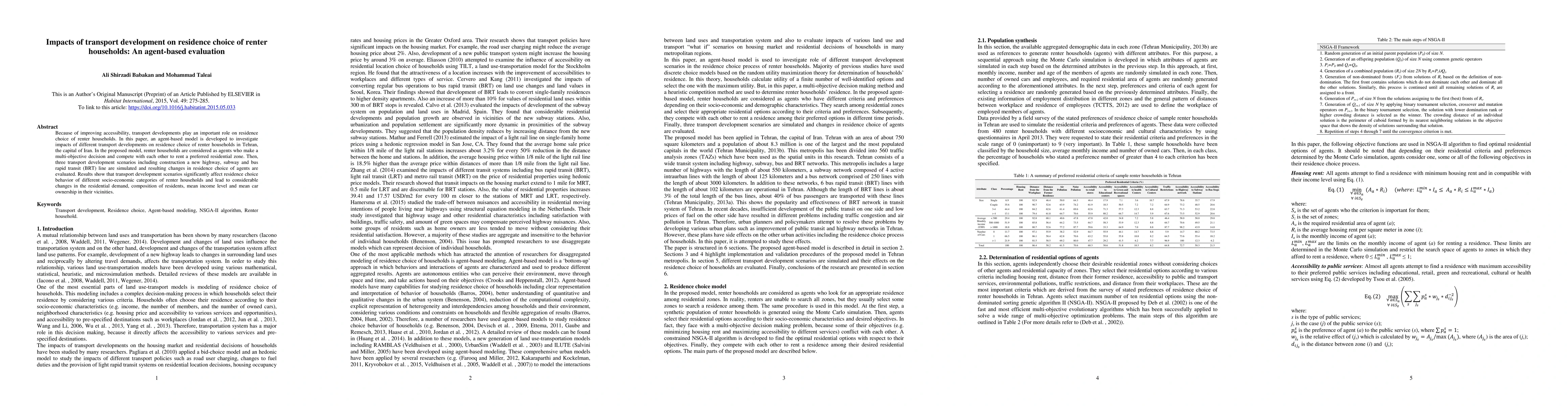 This paper develops an agent-based model to evaluate how transport developments influence the residence choice of renter households in Tehran, Iran. The study simulates three transport scenarios—new highway, subway, and BRT—showing significant impacts on residence choice, altering residential demand, resident composition, income levels, and car ownership.