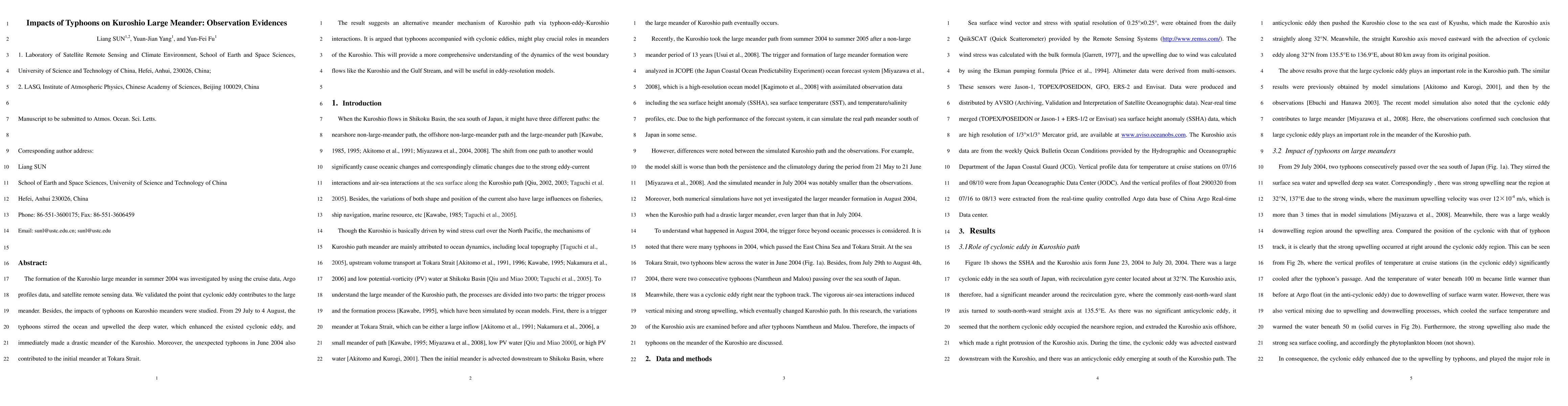 The formation of the Kuroshio large meander in summer 2004 was investigated by using the cruise data, Argo profiles data, and satellite remote sensing data. We validated the point that cyclonic eddy contributes to the large meander. Besides, the impacts of typhoons on Kuroshio meanders were studied. From 29 July to 4 August, the typhoons stirred the ocean and upwelled the deep water, which enhanced the existed cyclonic eddy, and immediately made a drastic meander of the Kuroshio. Moreover, the unexpected typhoons in June 2004 also contributed to the initial meander at Tokara Strait. The result suggests an alternative meander mechanism of Kuroshio path via typhoon-eddy-Kuroshio interactions. It is argued that typhoons accompanied with cyclonic eddies, might play crucial roles in meanders of the Kuroshio. This will provide a more comprehensive understanding of the dynamics of the west boundary flows like the Kuroshio and the Gulf Stream, and will be useful in eddy-resolution models.