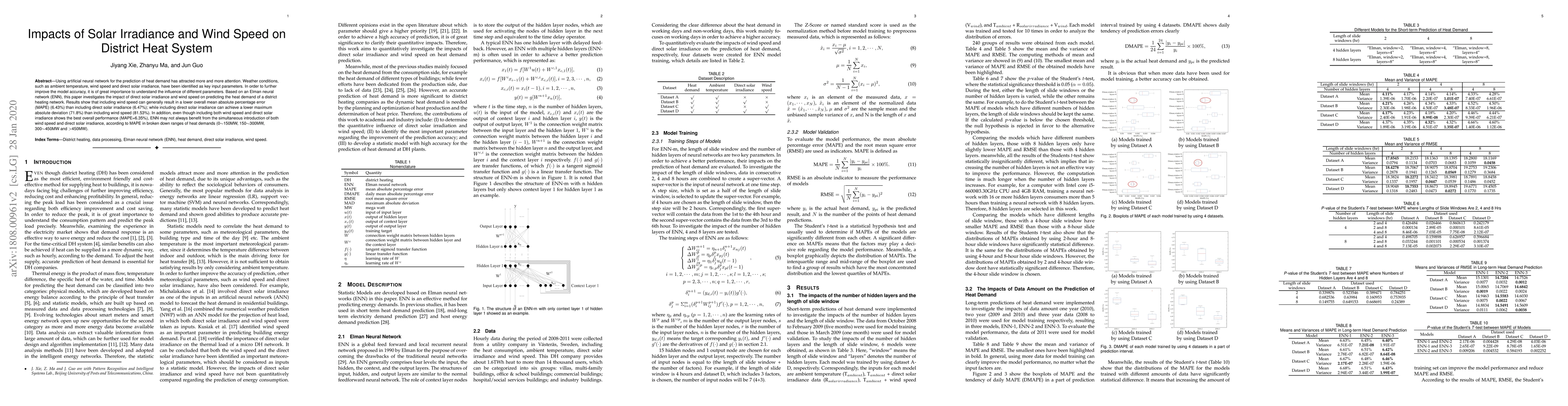 Using artificial neural network for the prediction of heat demand has attracted more and more attention. Weather conditions, such as ambient temperature, wind speed and direct solar irradiance, have been identified as key input parameters. In order to further improve the model accuracy, it is of great importance to understand the influence of different parameters. Based on an Elman neural network (ENN), this paper investigates the impact of direct solar irradiance and wind speed on predicting the heat demand of a district heating network. Results show that including wind speed can generally result in a lower overall mean absolute percentage error (MAPE) (6.43%) than including direct solar irradiance (6.47%); while including direct solar irradiance can achieve a lower maximum absolute deviation (71.8%) than including wind speed (81.53%). In addition, even though including both wind speed and direct solar irradiance shows the best overall performance (MAPE=6.35%).