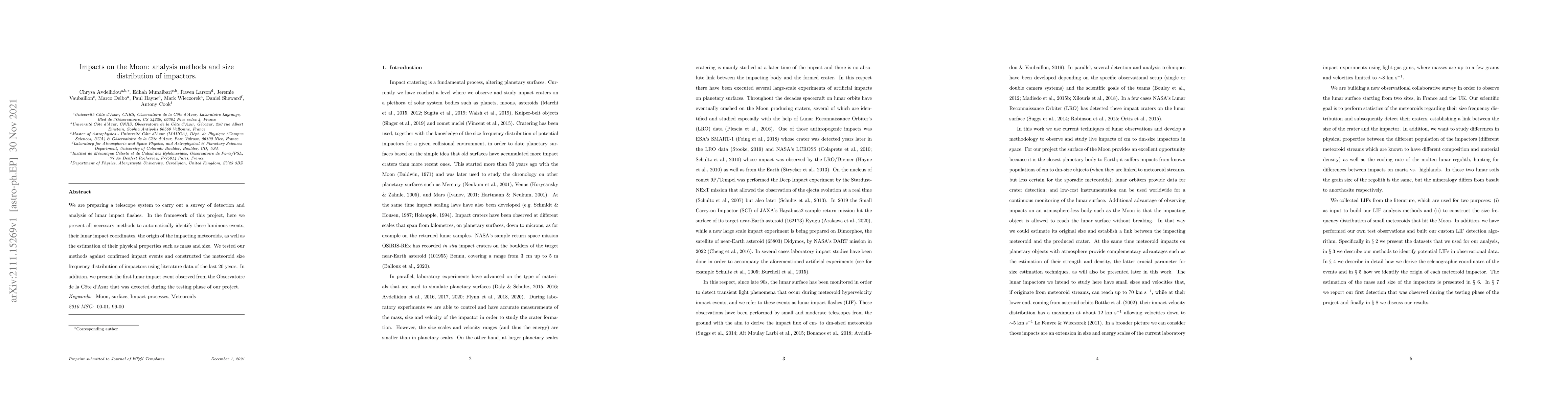 This paper presents methods for detecting and analyzing lunar impact flashes, including estimating meteoroid size and origin, and describes the first observed lunar impact event from a new telescope system. It also constructs the meteoroid size frequency distribution using 20 years of literature data.