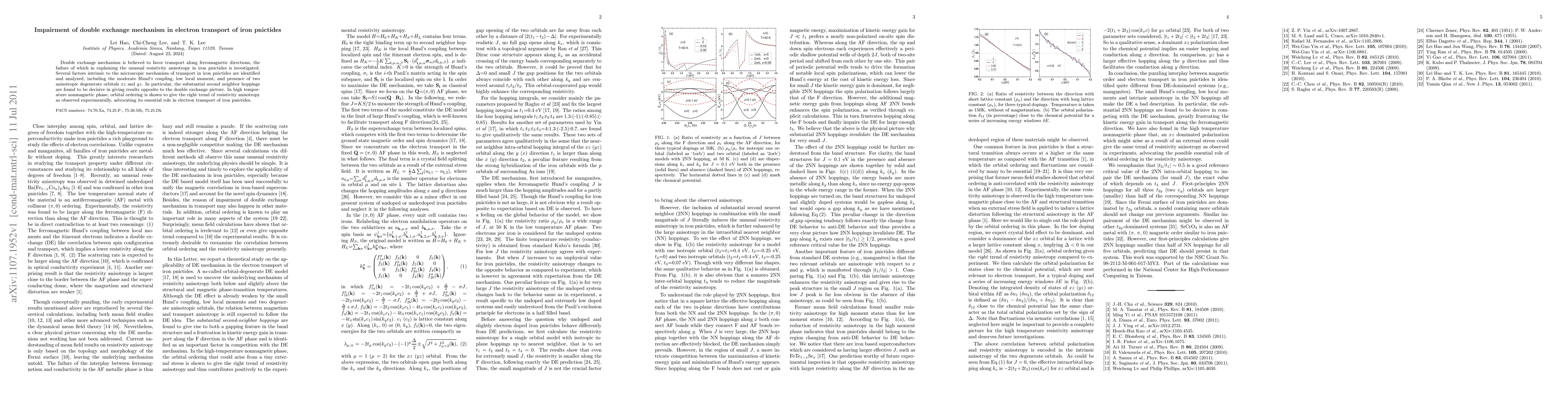 This paper investigates why the double exchange mechanism fails to explain the unusual resistivity anisotropy in iron pnictides. It identifies factors like moderate Hund's coupling and substantial second neighbor hoppings, concluding that orbital ordering, rather than double exchange, plays a crucial role in the electron transport in these materials.