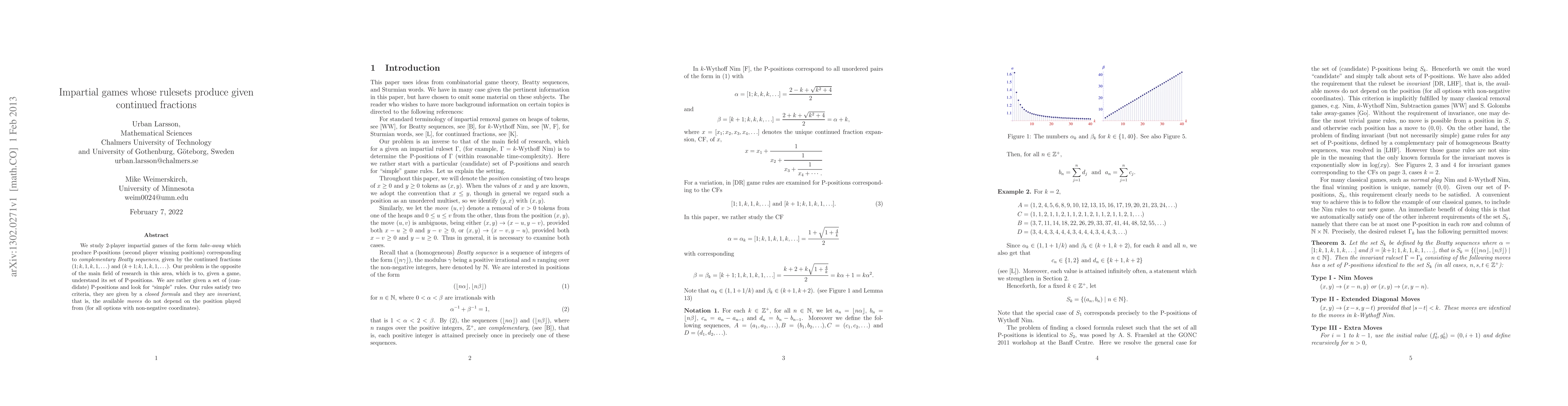 We study 2-player impartial games of the form take-away which produce P-positions (second player winning positions) corresponding to complementary Beatty sequences, given by the continued fractions (1;k,1,k,1,...) and (k+1;k,1,k,1,...). Our problem is the opposite of the main field of research in this area, which is to, given a game, understand its set of P-positions. We are rather given a set of (candidate) P-positions and look for "simple" rules. Our rules satisfy two criteria, they are given by a closed formula and they are invariant, that is, the available moves do not depend on the position played from (for all options with non-negative coordinates).