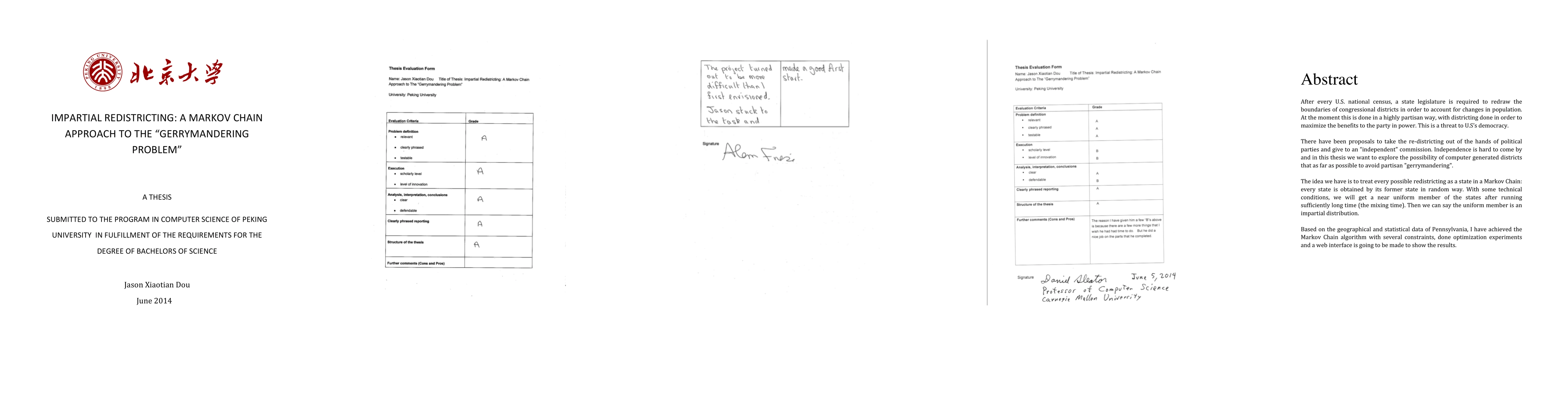 After every U.S. national census, a state legislature is required to redraw the boundaries of congressional districts in order to account for changes in population. At the moment this is done in a highly partisan way, with districting done in order to maximize the benefits to the party in power. This is a threat to U.S's democracy. There have been proposals to take the re-districting out of the hands of political parties and give to an "independent" commission. Independence is hard to come by and in this thesis we want to explore the possibility of computer generated districts that as far as possible to avoid partisan "gerrymandering". The idea we have is to treat every possible redistricting as a state in a Markov Chain: every state is obtained by its former state in random way. With some technical conditions, we will get a near uniform member of the states after running sufficiently long time (the mixing time). Then we can say the uniform member is an impartial distribution. Based on the geographical and statistical data of Pennsylvania, I have achieved the Markov Chain algorithm with several constraints, done optimization experiments and a web interface is going to be made to show the results.