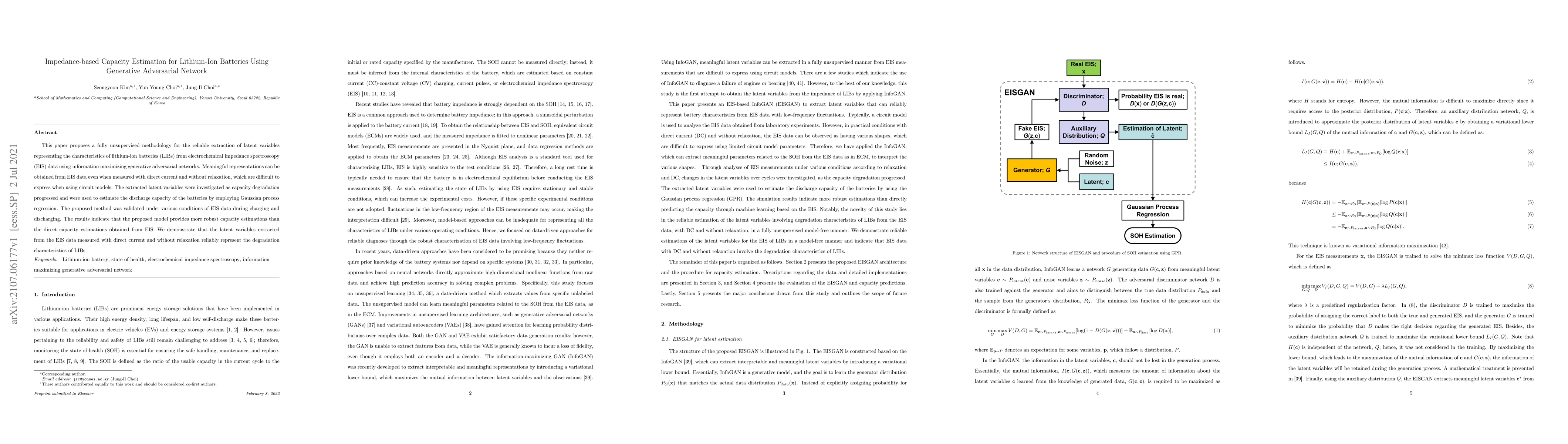 This paper proposes a fully unsupervised methodology for the reliable extraction of latent variables representing the characteristics of lithium-ion batteries (LIBs) from electrochemical impedance spectroscopy (EIS) data using information maximizing generative adversarial networks. Meaningful representations can be obtained from EIS data even when measured with direct current and without relaxation, which are difficult to express when using circuit models. The extracted latent variables were investigated as capacity degradation progressed and were used to estimate the discharge capacity of the batteries by employing Gaussian process regression. The proposed method was validated under various conditions of EIS data during charging and discharging. The results indicate that the proposed model provides more robust capacity estimations than the direct capacity estimations obtained from EIS. We demonstrate that the latent variables extracted from the EIS data measured with direct current and without relaxation reliably represent the degradation characteristics of LIBs.