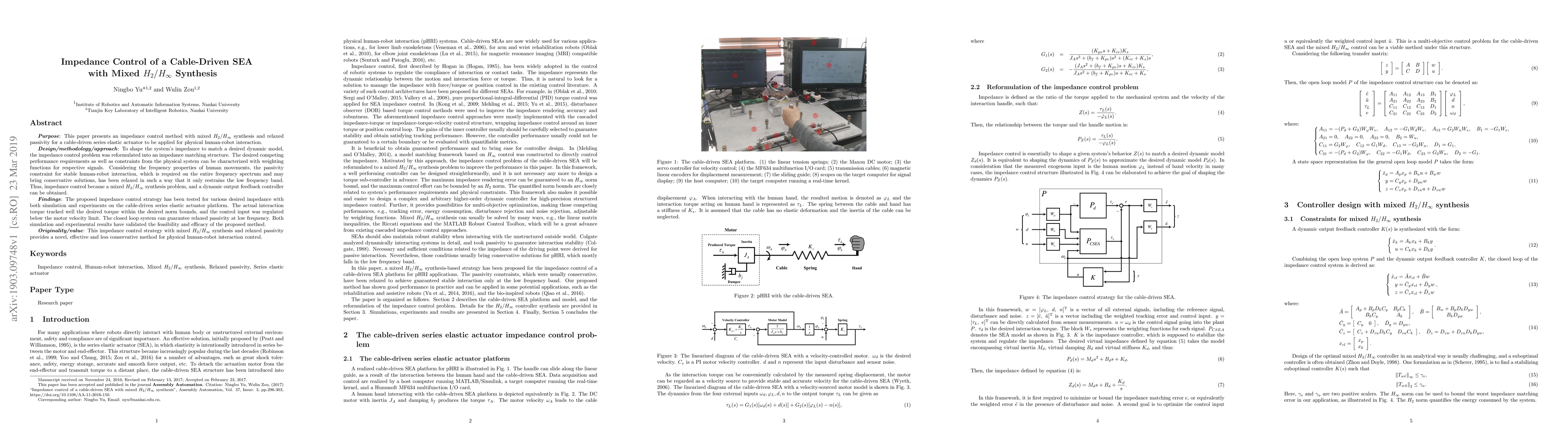 Purpose: This paper presents an impedance control method with mixed $H_2/H_\infty$ synthesis and relaxed passivity for a cable-driven series elastic actuator to be applied for physical human-robot interaction. Design/methodology/approach: To shape the system's impedance to match a desired dynamic model, the impedance control problem was reformulated into an impedance matching structure. The desired competing performance requirements as well as constraints from the physical system can be characterized with weighting functions for respective signals. Considering the frequency properties of human movements, the passivity constraint for stable human-robot interaction, which is required on the entire frequency spectrum and may bring conservative solutions, has been relaxed in such a way that it only restrains the low frequency band. Thus, impedance control became a mixed $H_2/H_\infty$ synthesis problem, and a dynamic output feedback controller can be obtained. Findings: The proposed impedance control strategy has been tested for various desired impedance with both simulation and experiments on the cable-driven series elastic actuator platform. The actual interaction torque tracked well the desired torque within the desired norm bounds, and the control input was regulated below the motor velocity limit. The closed loop system can guarantee relaxed passivity at low frequency. Both simulation and experimental results have validated the feasibility and efficacy of the proposed method. Originality/value: This impedance control strategy with mixed $H_2/H_\infty$ synthesis and relaxed passivity provides a novel, effective and less conservative method for physical human-robot interaction control.
