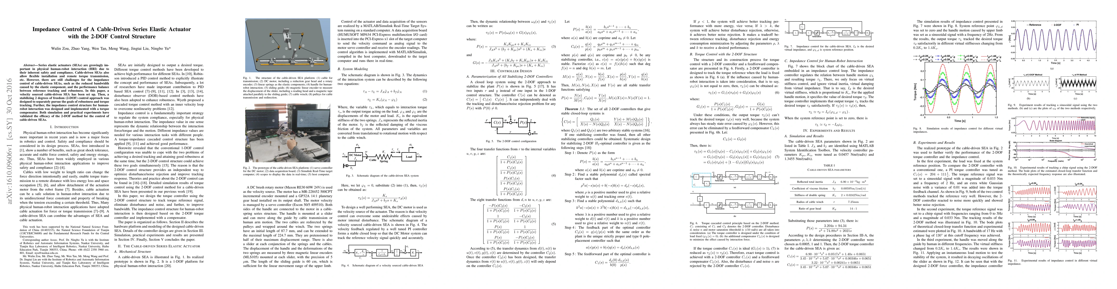 This paper proposes a 2-DOF control structure for impedance control of a cable-driven series elastic actuator (SEA), addressing challenges like reduced bandwidth and performance balance. The method achieves robustness and reference tracking, validated through simulations and practical experiments.