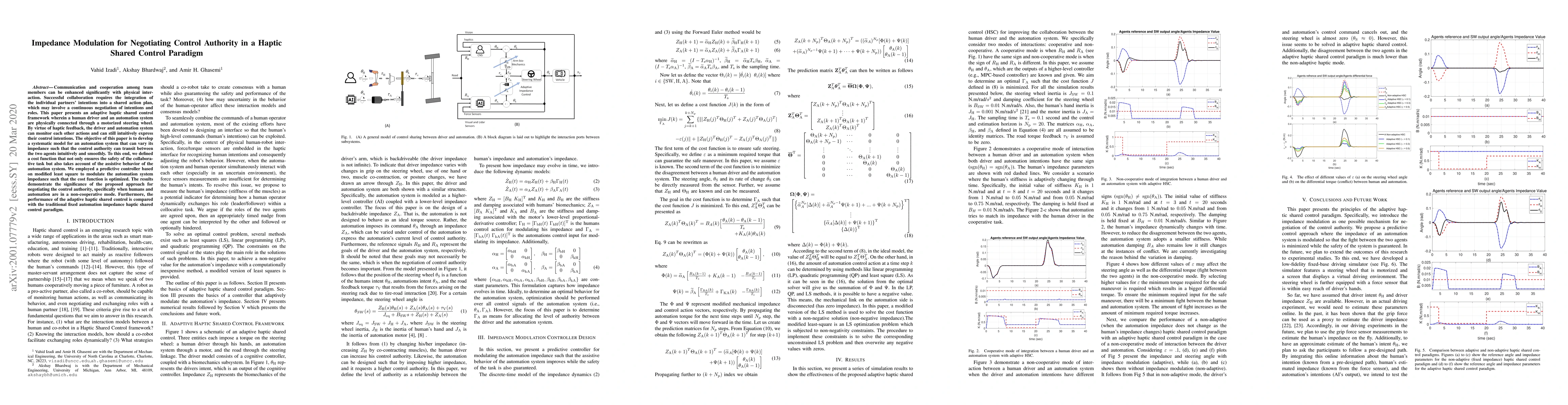Communication and cooperation among team members can be enhanced significantly with physical interaction. Successful collaboration requires the integration of the individual partners' intentions into a shared action plan, which may involve a continuous negotiation of intentions and roles. This paper presents an adaptive haptic shared control framework wherein a human driver and an automation system are physically connected through a motorized steering wheel. By virtue of haptic feedback, the driver and automation system can monitor each other actions and can still intuitively express their control intentions. The objective of this paper is to develop a systematic model for an automation system that can vary its impedance such that the control authority can transit between the two agents intuitively and smoothly. To this end, we defined a cost function that not only ensures the safety of the collaborative task but also takes account of the assistive behavior of the automation system. We employed a predictive controller based on modified least square to modulate the automation system impedance such that the cost function is optimized. The results demonstrate the significance of the proposed approach for negotiating the control authority, specifically when humans and automation are in a non-cooperative mode. Furthermore, the performance of the adaptive haptic shared control is compared with the traditional fixed automation impedance haptic shared control paradigm.
