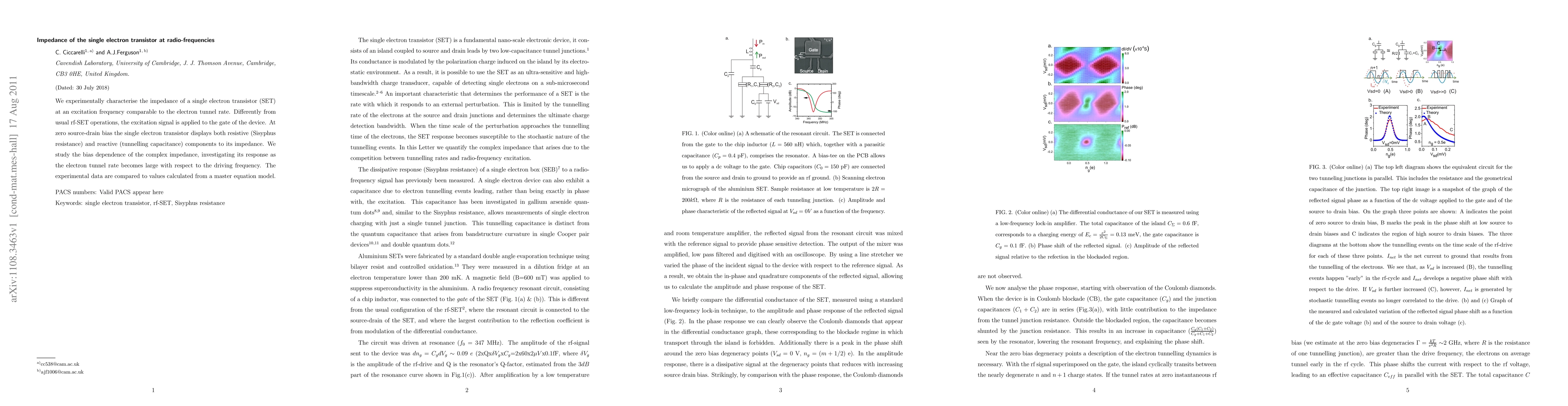 This paper experimentally characterizes the impedance of a single electron transistor (SET) at radio frequencies, focusing on applying the excitation signal to the gate. It identifies both resistive and reactive components of impedance, particularly the Sisyphus resistance and tunnelling capacitance, and examines how these change with bias voltage. Results are compared to theoretical models derived from a master equation.