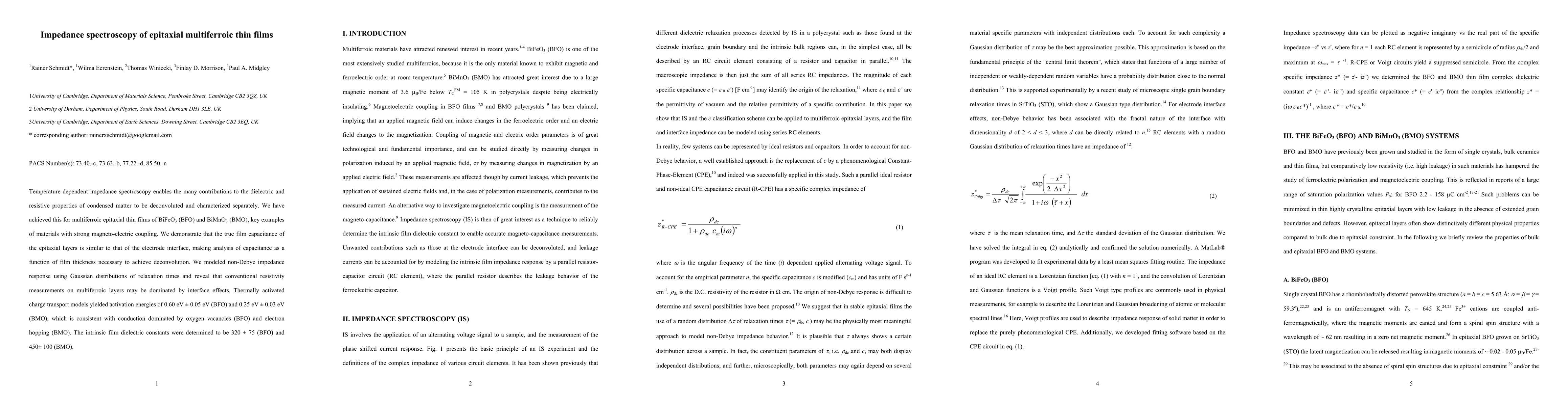 Researchers used impedance spectroscopy to study multiferroic thin films, revealing that conventional resistivity measurements may be dominated by interface effects, and providing insights into the film's dielectric constants and charge transport mechanisms.