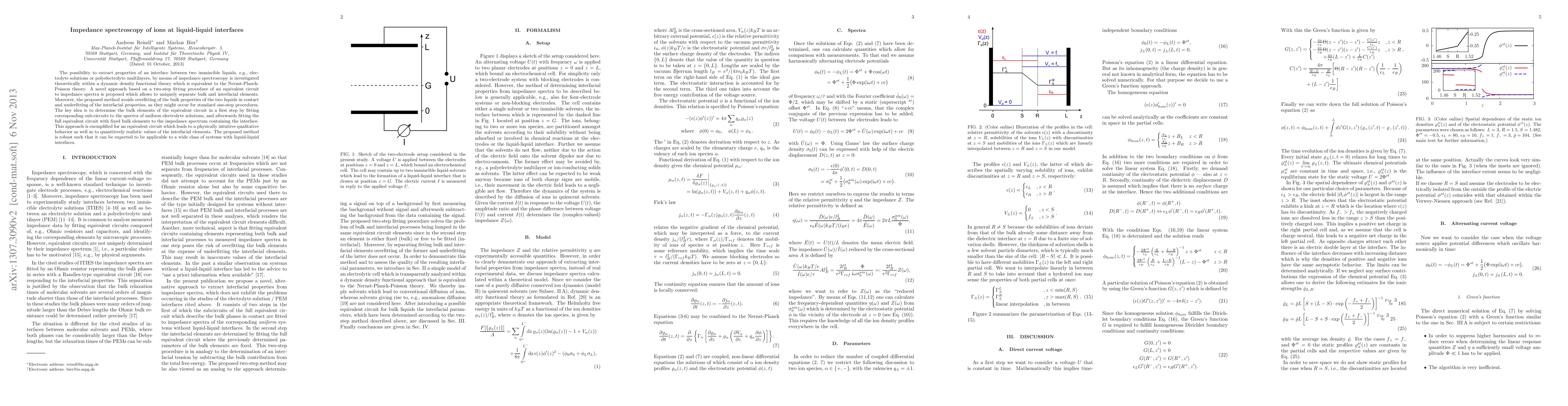 The possibility to extract properties of an interface between two immiscible liquids, e.g., electrolyte solutions or polyelectrolyte multilayers, by means of impedance spectroscopy is investigated theoretically within a dynamic density functional theory which is equivalent to the Nernst-Planck-Poisson theory. A novel approach based on a two-step fitting procedure of an equivalent circuit to impedance spectra is proposed which allows to uniquely separate bulk and interfacial elements. Moreover, the proposed method avoids overfitting of the bulk properties of the two liquids in contact and underfitting of the interfacial properties, as they might occur for standard one-step procedures. The key idea is to determine the bulk elements of the equivalent circuit in a first step by fitting corresponding sub-circuits to the spectra of uniform electrolyte solutions, and afterwards fitting the full equivalent circuit with fixed bulk elements to the impedance spectrum containing the interface. This approach is exemplified for an equivalent circuit which leads to a physically intuitive qualitative behavior as well as to quantitively realistic values of the interfacial elements. The proposed method is robust such that it can be expected to be applicable to a wide class of systems with liquid-liquid interfaces.