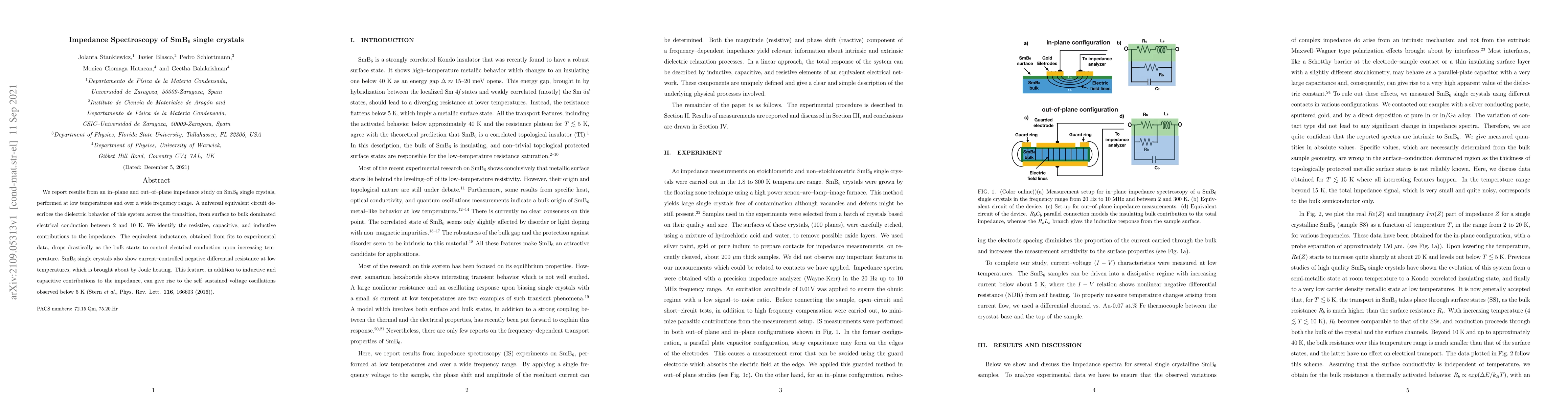 We report results from an in--plane and out--of--plane impedance study on SmB$_6$ single crystals, performed at low temperatures and over a wide frequency range. A universal equivalent circuit describes the dielectric behavior of this system across the transition, from surface to bulk dominated electrical conduction between 2 and 10 K. We identify the resistive, capacitive, and inductive contributions to the impedance. The equivalent inductance, obtained from fits to experimental data, drops drastically as the bulk starts to control electrical conduction upon increasing temperature. SmB$_6$ single crystals also show current--controlled negative differential resistance at low temperatures, which is brought about by Joule heating. This feature, in addition to inductive and capacitive contributions to the impedance, can give rise to the self--sustained voltage oscillations observed below 5 K (Stern {\it et al.}, Phys. Rev. Lett. {\bf 116}, 166603 (2016)).