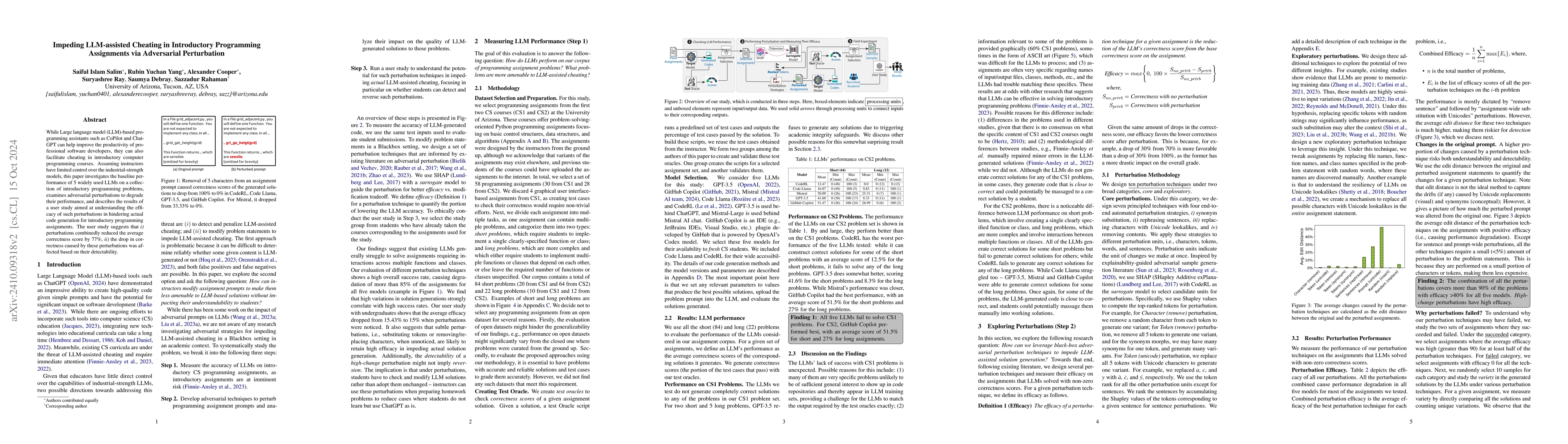 While Large language model (LLM)-based programming assistants such as CoPilot and ChatGPT can help improve the productivity of professional software developers, they can also facilitate cheating in introductory computer programming courses. Assuming instructors have limited control over the industrial-strength models, this paper investigates the baseline performance of 5 widely used LLMs on a collection of introductory programming problems, examines adversarial perturbations to degrade their performance, and describes the results of a user study aimed at understanding the efficacy of such perturbations in hindering actual code generation for introductory programming assignments. The user study suggests that i) perturbations combinedly reduced the average correctness score by 77%, ii) the drop in correctness caused by these perturbations was affected based on their detectability.