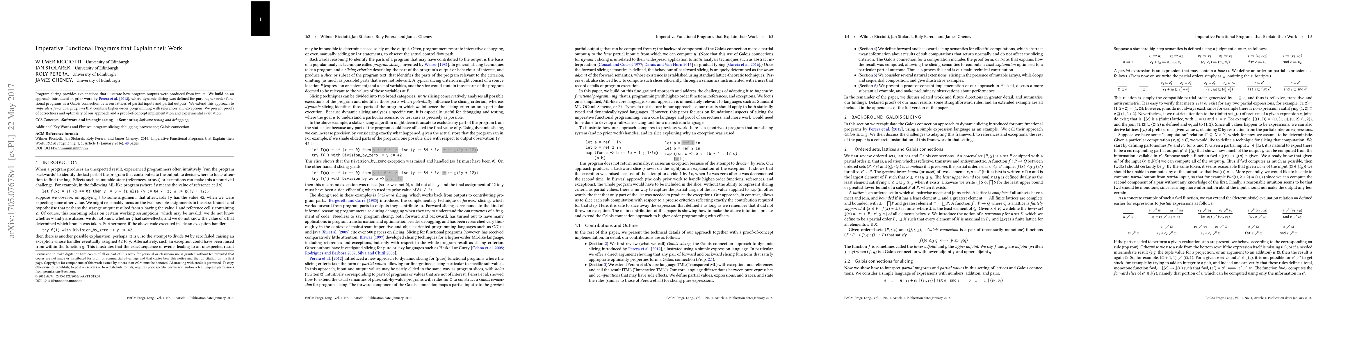 Program slicing provides explanations that illustrate how program outputs were produced from inputs. We build on an approach introduced in prior work by Perera et al., where dynamic slicing was defined for pure higher-order functional programs as a Galois connection between lattices of partial inputs and partial outputs. We extend this approach to imperative functional programs that combine higher-order programming with references and exceptions. We present proofs of correctness and optimality of our approach and a proof-of-concept implementation and experimental evaluation.