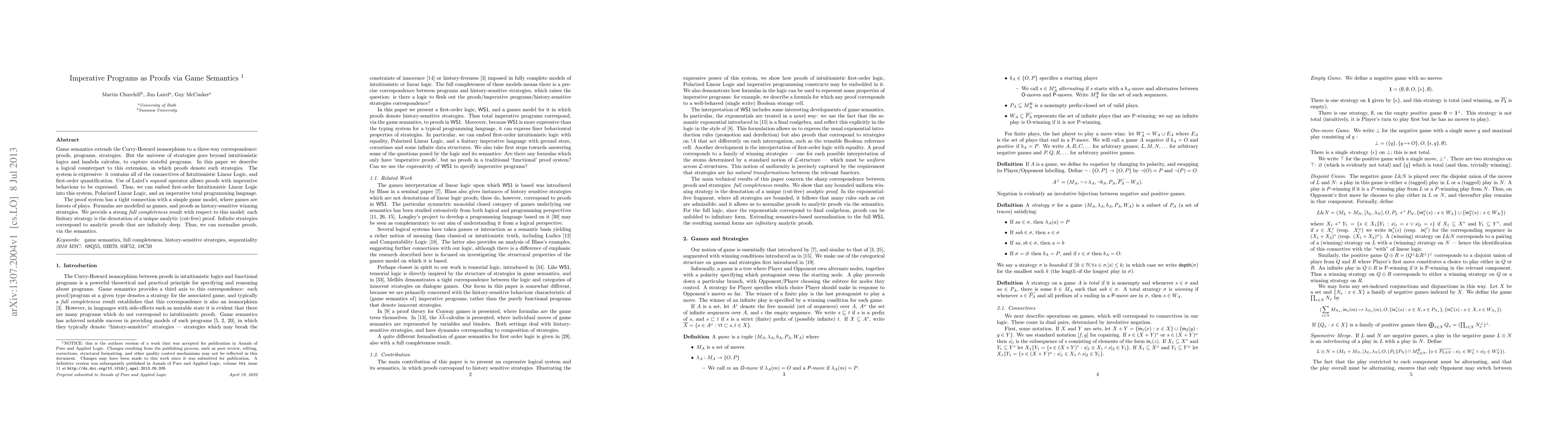 This paper extends the Curry-Howard isomorphism to include imperative programs as proofs through game semantics, embedding first-order Intuitionistic Linear Logic into Polarized Linear Logic. It establishes a strong full completeness result linking proofs to history-sensitive winning strategies in a game model.