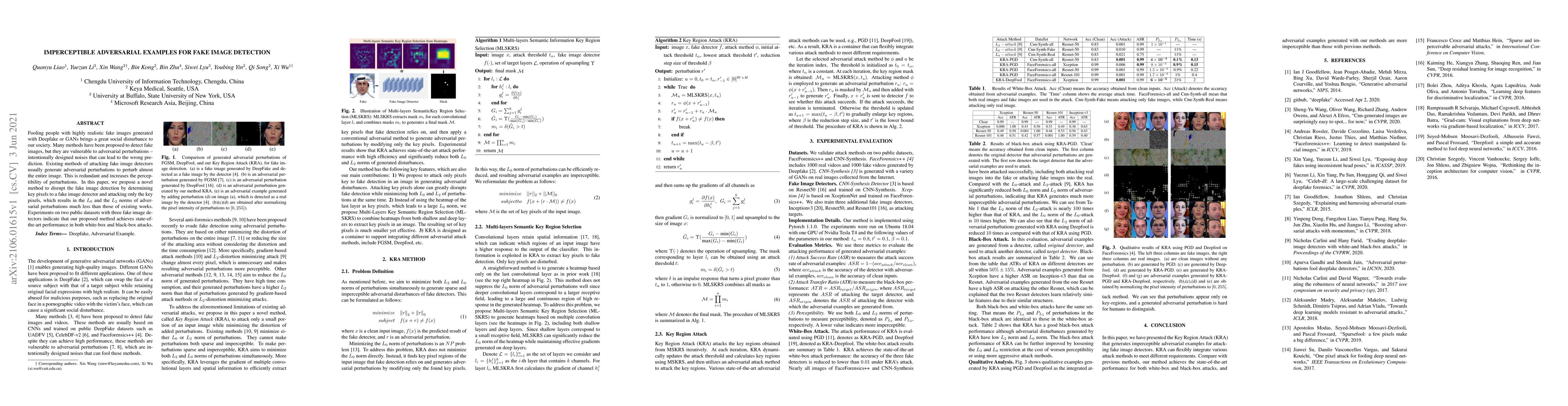 This paper introduces a novel method to generate imperceptible adversarial examples for fake image detection by targeting only key pixels, significantly reducing the $L_0$ and $L_2$ norms of perturbations compared to existing methods. Experimental results show superior performance in both white-box and black-box attacks on two public datasets.