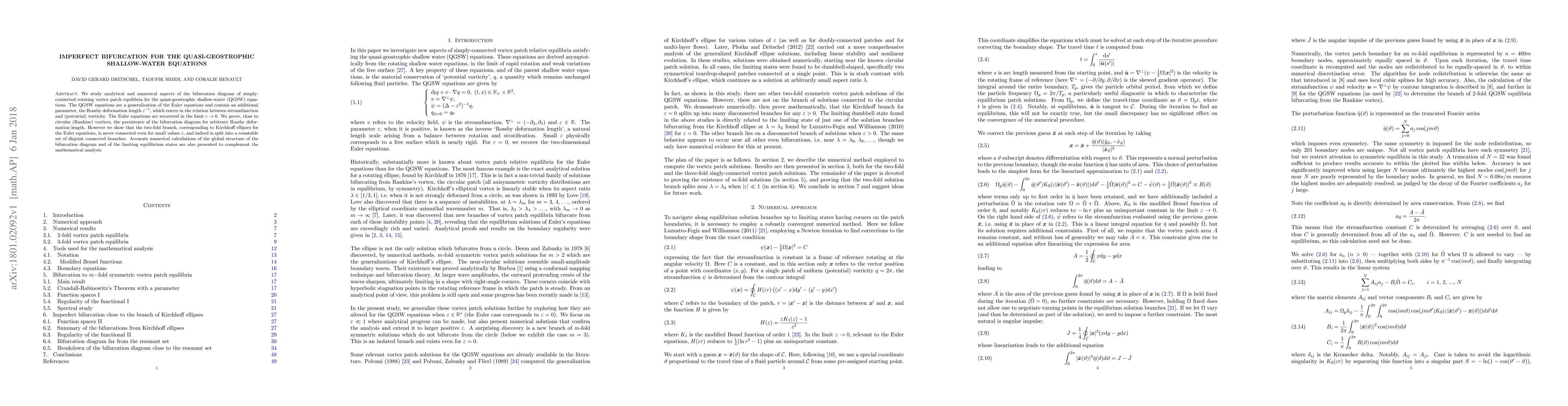 We study analytical and numerical aspects of the bifurcation diagram of simply-connected rotating vortex patch equilibria for the quasi-geostrophic shallow-water (QGSW) equations. The QGSW equations are a generalisation of the Euler equations and contain an additional parameter, the Rossby deformation length $\EE^{-1}$, which enters in the relation between streamfunction and (potential) vorticity. The Euler equations are recovered in the limit $\EE\to 0$. We prove, close to circular (Rankine) vortices, the persistence of the bifurcation diagram for arbitrary Rossby deformation length. However we show that the two-fold branch, corresponding to Kirchhoff ellipses for the Euler equations, is never connected even for small values $\EE$, and indeed is split into a countable set of disjoint connected branches. Accurate numerical calculations of the global structure of the bifurcation diagram and of the limiting equilibrium states are also presented to complement the mathematical analysis.