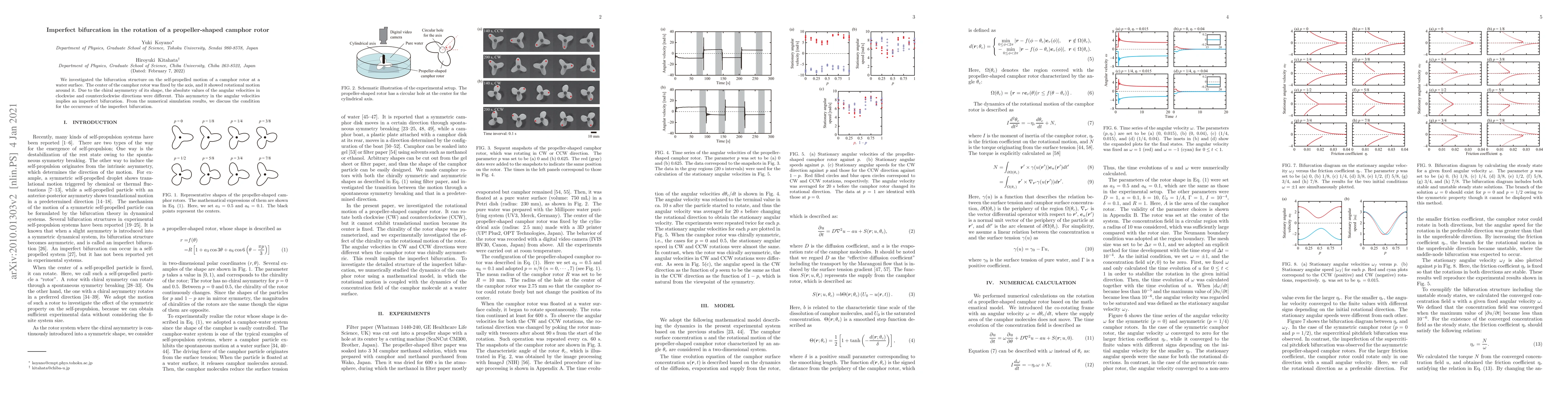 We investigated the bifurcation structure on the self-propelled motion of a camphor rotor at a water surface. The center of the camphor rotor was fixed by the axis, and it showed rotational motion around it. Due to the chiral asymmetry of its shape, the absolute values of the angular velocities in clockwise and counterclockwise directions were different. This asymmetry in the angular velocities implies an imperfect bifurcation. From the numerical simulation results, we discuss the condition for the occurrence of the imperfect bifurcation.
