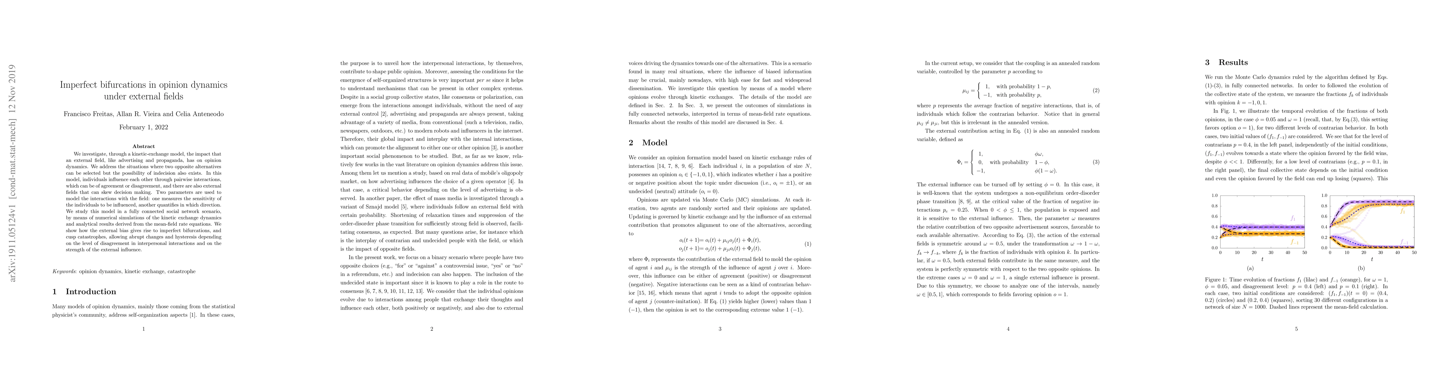This paper examines how external influences, such as advertising, affect opinion dynamics using a kinetic-exchange model. It reveals that external fields cause imperfect bifurcations and cusp catastrophes, leading to abrupt changes and hysteresis in opinion formation, depending on interpersonal disagreements and the strength of external influence.