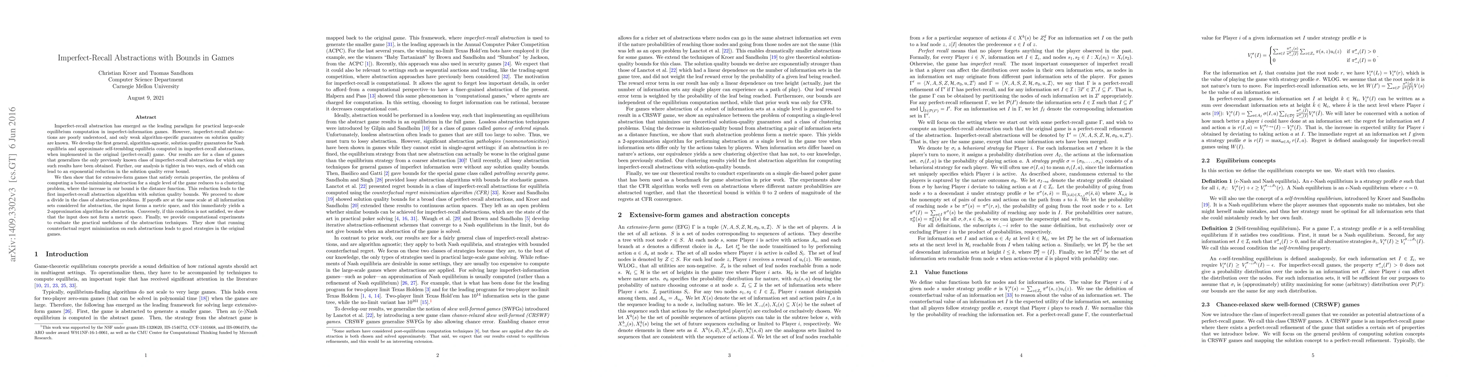 This paper presents the first general, algorithm-agnostic guarantees for solution quality in Nash equilibria and approximate self-trembling equilibria computed via imperfect-recall abstractions in large-scale games. It also introduces a new abstraction algorithm with solution quality bounds, demonstrating the problem of computing a bound-minimizing abstraction as a clustering problem.