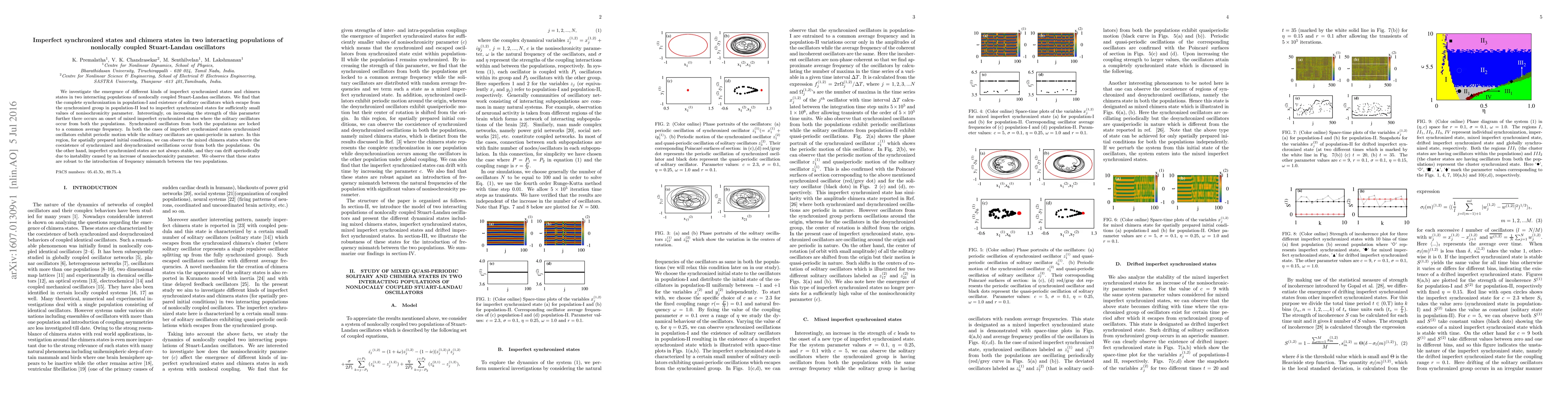 We investigate the emergence of different kinds of imperfect synchronized states and chimera states in two interacting populations of nonlocally coupled Stuart-Landau oscillators. We find that the complete synchronization in population-I and existence of solitary oscillators which escape from the synchronized group in population-II lead to imperfect synchronized states for sufficiently small values of nonisochronicity parameter. Interestingly, on increasing the strength of this parameter further there occurs an onset of mixed imperfect synchronized states where the solitary oscillators occur from both the populations. Synchronized oscillators from both the populations are locked to a common average frequency. In both the cases of imperfect synchronized states synchronized oscillators exhibit periodic motion while the solitary oscillators are quasi-periodic in nature. In this region, for spatially prepared initial conditions, we can observe the mixed chimera states where the coexistence of synchronized and desynchronized oscillations occur from both the populations. On the other hand, imperfect synchronized states are not always stable, and they can drift aperiodically due to instability caused by an increase of nonisochronicity parameter. We observe that these states are robust to the introduction of frequency mismatch between the two populations.