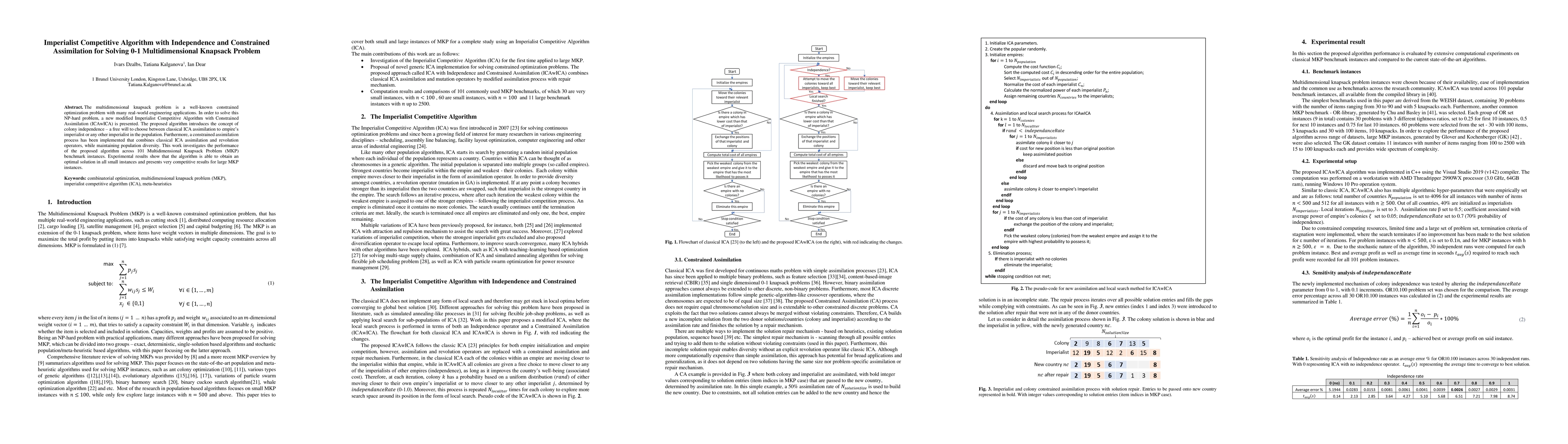 This paper proposes a modified Imperialist Competitive Algorithm with Independence and Constrained Assimilation (ICAwICA) to solve the multidimensional knapsack problem. The algorithm allows colonies to independently choose assimilation and integrates constrained assimilation to maintain diversity, achieving optimal results for small instances and competitive results for larger ones.
