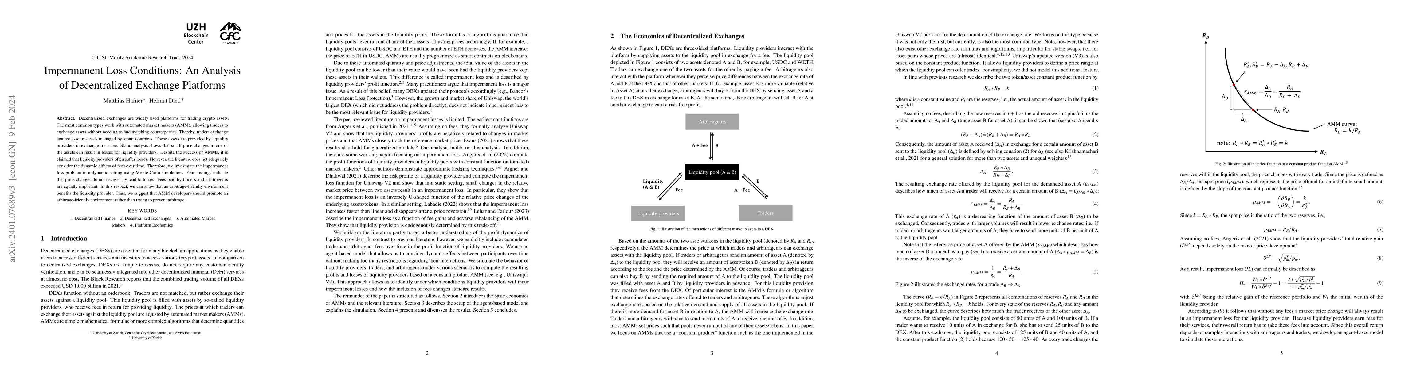 This paper analyzes the impermanent loss problem in decentralized exchanges using AMMs, finding that while small price changes can lead to losses, dynamic fee structures and arbitrage opportunities mitigate these losses. It concludes that fostering an arbitrage-friendly environment benefits liquidity providers.