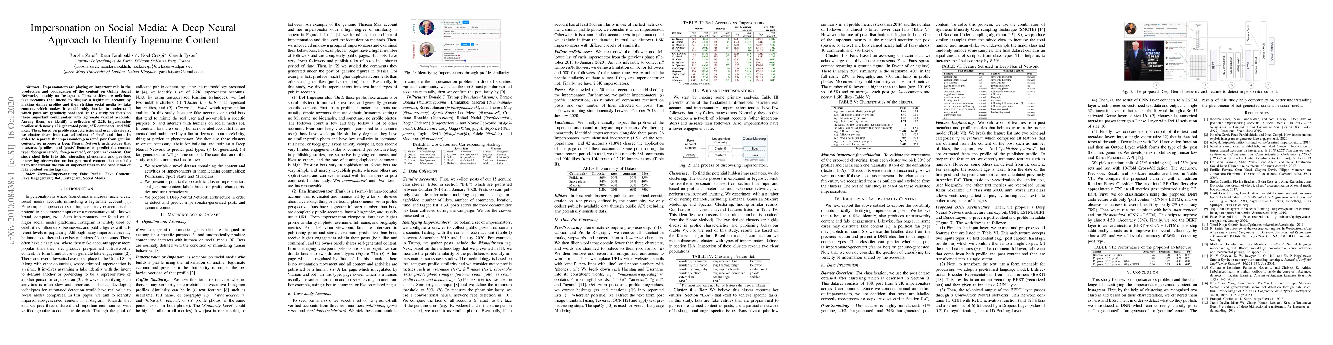 This study investigates impersonation on Instagram by analyzing 2.2K impersonator profiles and nearly 10k posts. A Deep Neural Network architecture is proposed to distinguish between bot-generated, fan-generated, and genuine content based on profile and post features, shedding light on the role of impersonators in spreading fake content.
