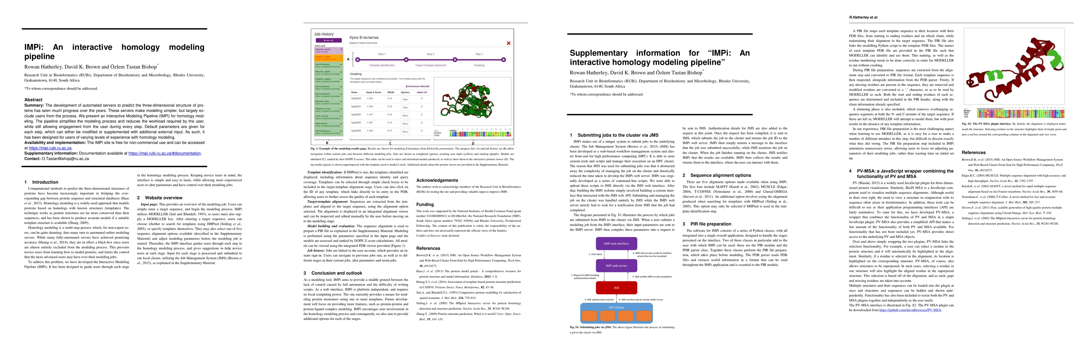 Summary: The development of automated servers to predict the three-dimensional structure of proteins has seen much progress over the years. These servers make modeling simpler, but largely exclude users from the process. We present an Interactive Modeling Pipeline (IMPi) for homology modeling. The pipeline simplifies the modeling process and reduces the workload required by the user, while still allowing engagement from the user during every step. Default parameters are given for each step, which can either be modified or supplemented with additional external input. As such, it has been designed for users of varying levels of experience with homology modeling. Availability and implementation: The IMPi site is free for non-commercial use and can be accessed at https://impi.rubi.ru.ac.za. Supplementary information: Documentation available at https://impi.rubi.ru.ac.za/#documentation.
