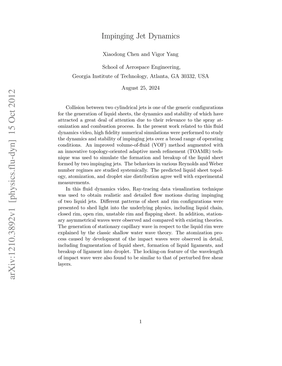 This study employs ray-tracing data visualization to analyze the dynamics of impinging liquid jets, revealing various flow patterns and stationary capillary waves. It also details the atomization process, including the formation and breakup of liquid ligaments into droplets, and compares observed phenomena with existing theories.