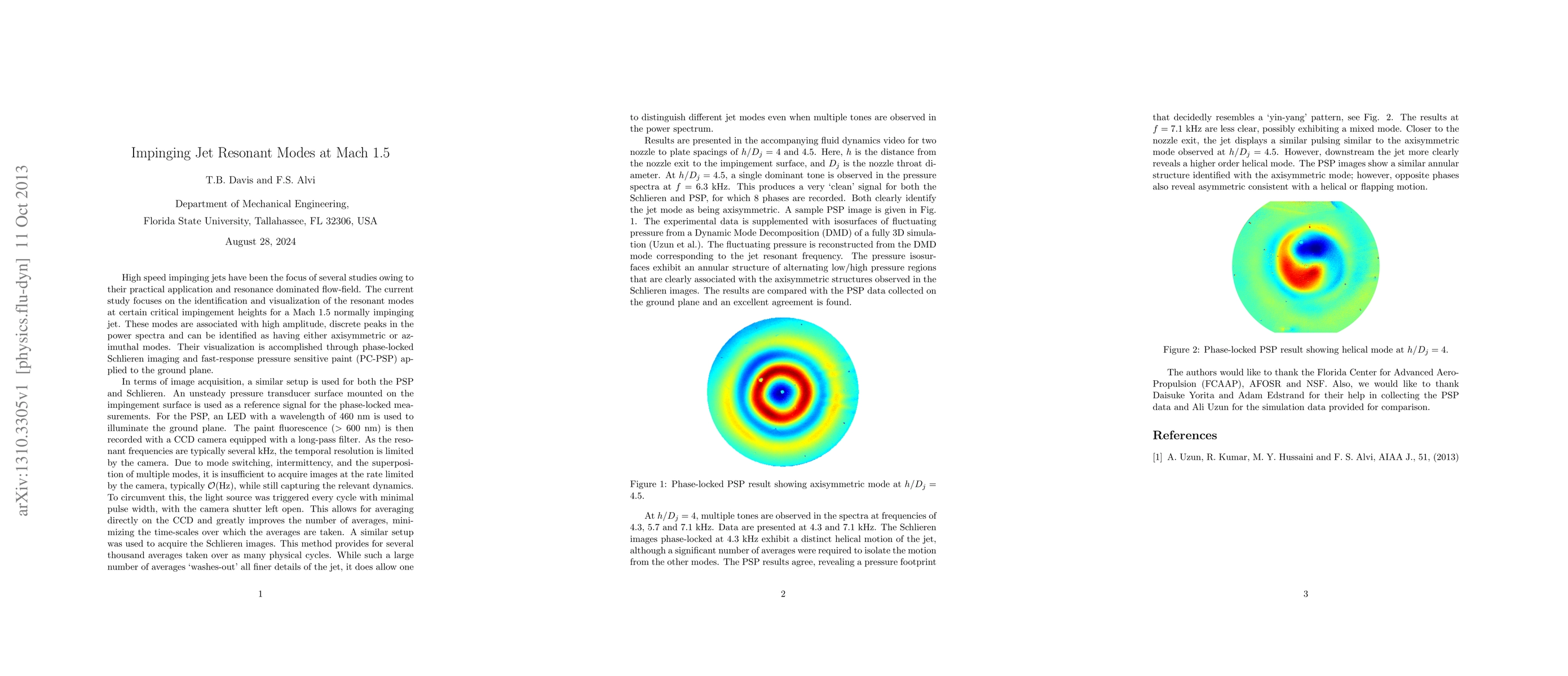 This study identifies and visualizes resonant modes in high-speed impinging jets at Mach 1.5 using phase-locked Schlieren imaging and pressure sensitive paint, revealing axisymmetric and azimuthal modes associated with high amplitude, discrete peaks in power spectra.