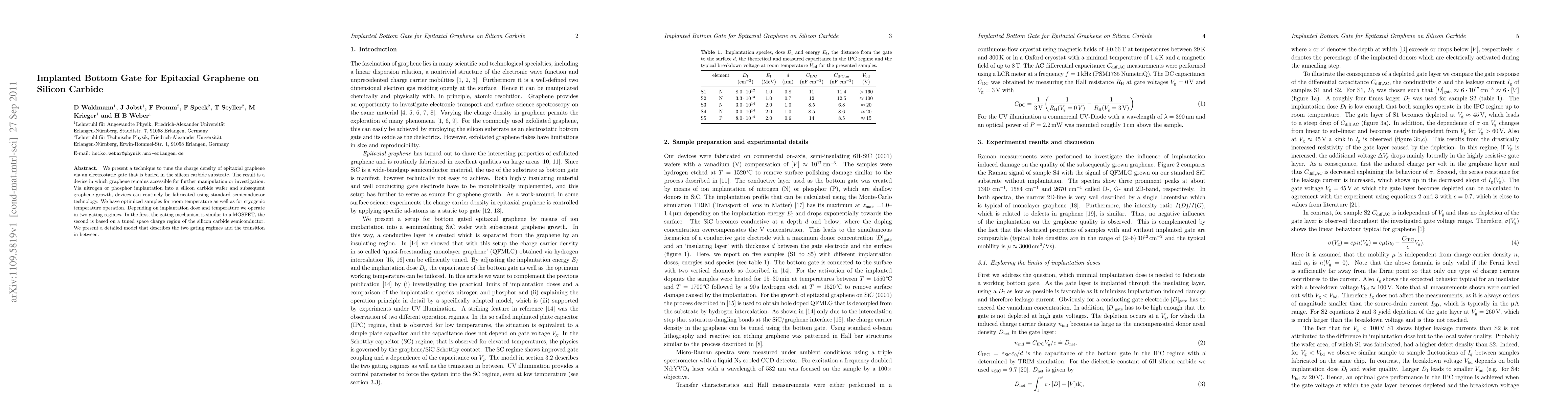 This research introduces a novel bottom gate technique for tuning charge density in epitaxial graphene on silicon carbide, employing nitrogen or phosphor implantation followed by standard semiconductor fabrication methods. The study details two operational gating regimes and presents a comprehensive model explaining the transition between them.