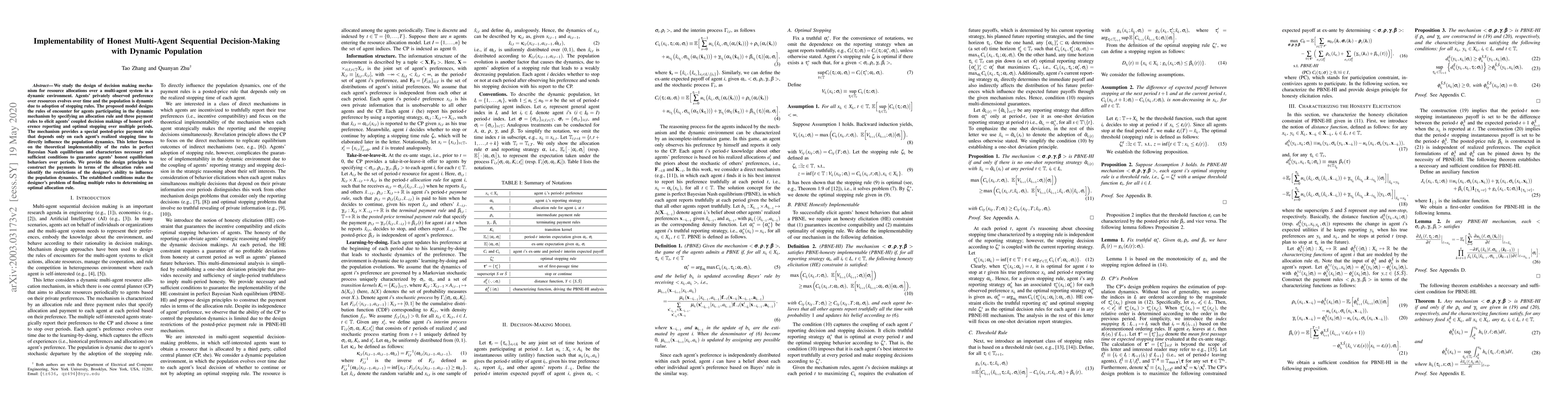 We study the design of decision-making mechanism for resource allocations over a multi-agent system in a dynamic environment. Agents' privately observed preference over resources evolves over time and the population is dynamic due to the adoption of stopping rules. The proposed model designs the rules of encounter for agents participating in the dynamic mechanism by specifying an allocation rule and three payment rules to elicit agents' coupled decision makings of honest preference reporting and optimal stopping over multiple periods. The mechanism provides a special posted-price payment rule that depends only on each agent's realized stopping time to directly influence the population dynamics. This letter focuses on the theoretical implementability of the rules in perfect Bayesian Nash equilibrium and characterizes necessary and sufficient conditions to guarantee agents' honest equilibrium behaviors over periods. We provide the design principles to construct the payments in terms of the allocation rules and identify the restrictions of the designer's ability to influence the population dynamics. The established conditions make the designer's problem of finding multiple rules to determine an optimal allocation rule.