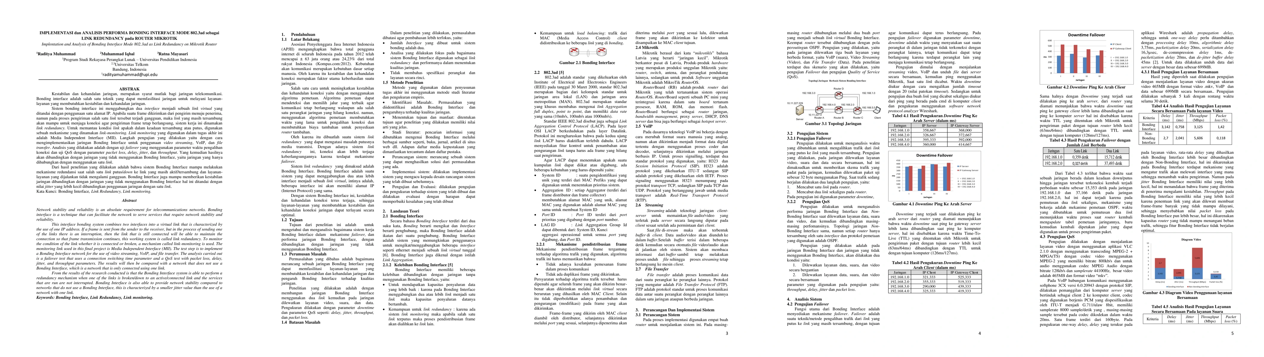 This study investigates the implementation and performance of Bonding Interface Mode 802.3ad as a link redundancy mechanism on Router Mikrotik, showing improved network stability and reliability through failover tests and quality of service analysis.