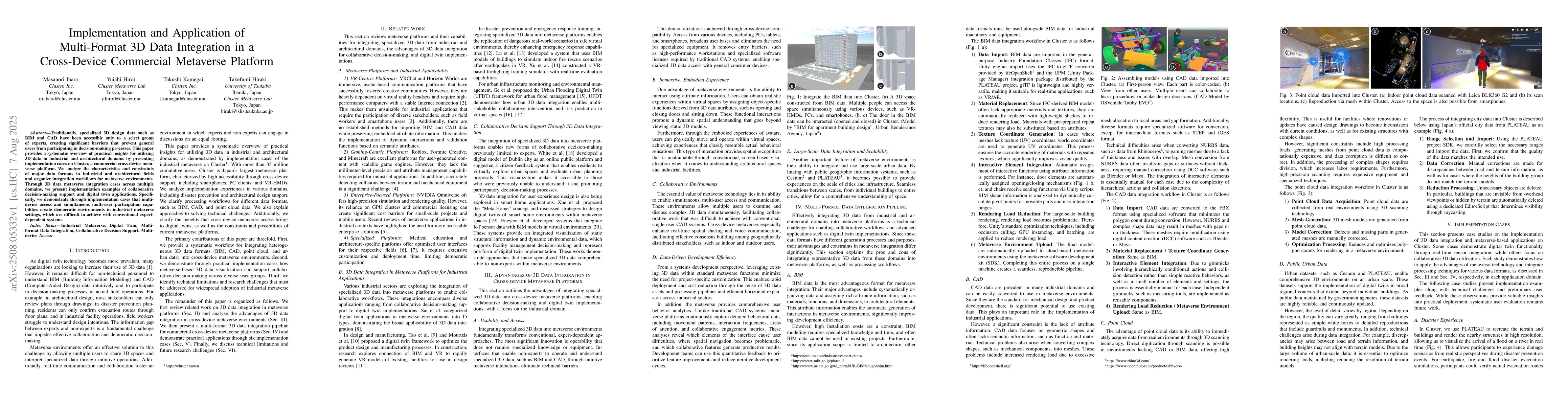 Traditionally, specialized 3D design data, such as BIM and CAD, have been accessible only to a select group of experts, creating significant barriers that prevent general users from participating in decision-making processes. This paper provides a systematic overview of practical insights for utilizing 3D data in industrial and architectural domains by presenting implementation cases of the industrial metaverse on Cluster, a commercial cross-device metaverse platform. This paper analyzes the characteristics and constraints of major data formats in the industrial and architectural fields and organizes integration workflows for the metaverse. Through application cases utilizing 3D data across multiple domains, we present practical examples of collaborative decision-making support enabled by the fusion of metaverse and digital twin technologies. Specifically, we demonstrate that multi-device access and simultaneous multi-user participation capabilities foster democratic environments in the industrial metaverse, which are challenging to achieve with conventional, expert-dependent systems.
