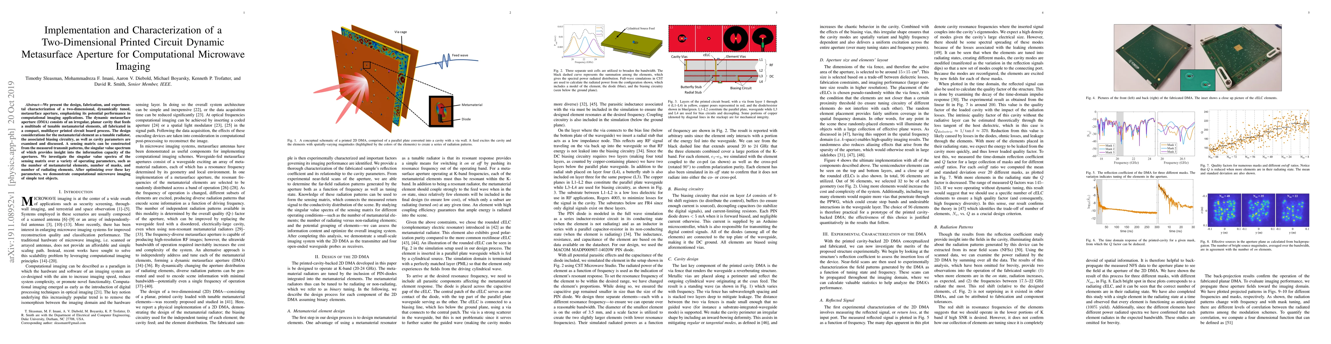 We present the design, fabrication, and experimental characterization of a two-dimensional, dynamically tuned, metasurface aperture, emphasizing its potential performance in computational imaging applications. The dynamic metasurface aperture (DMA) consists of an irregular, planar cavity that feeds a multitude of tunable metamaterial elements, all fabricated in a compact, multilayer printed circuit board process. The design considerations for the metamaterial element as a tunable radiator, the associated biasing circuitry, as well as cavity parameters are examined and discussed. A sensing matrix can be constructed from the measured transmit patterns, the singular value spectrum of which provides insight into the information capacity of the apertures. We investigate the singular value spectra of the sensing matrix over a variety of operating parameters, such as the number of metamaterial elements, number of masks, and number of radiating elements. After optimizing over these key parameters, we demonstrate computational microwave imaging of simple test objects.