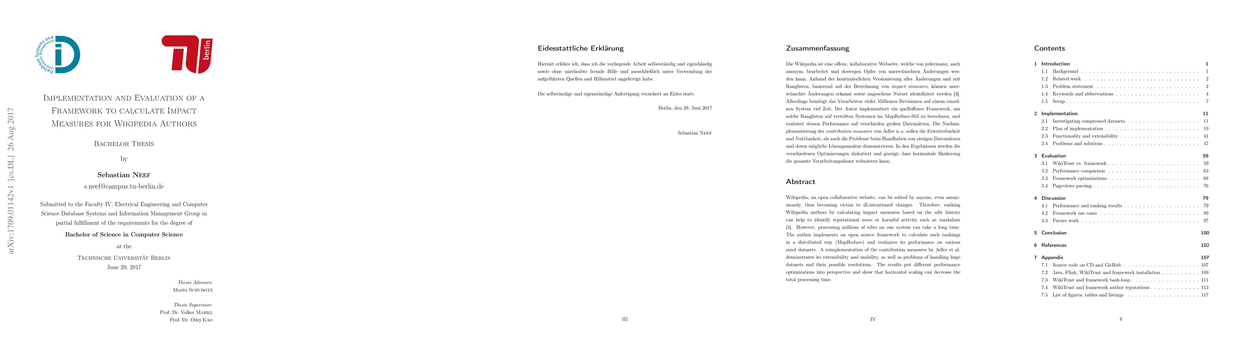 Wikipedia, an open collaborative website, can be edited by anyone, even anonymously, thus becoming victim to ill-intentioned changes. Therefore, ranking Wikipedia authors by calculating impact measures based on the edit history can help to identify reputational users or harmful activity such as vandalism \cite{Adler:2008:MAC:1822258.1822279}. However, processing millions of edits on one system can take a long time. The author implements an open source framework to calculate such rankings in a distributed way (MapReduce) and evaluates its performance on various sized datasets. A reimplementation of the contribution measures by \citeauthor{Adler:2008:MAC:1822258.1822279} demonstrates its extensibility and usability, as well as problems of handling huge datasets and their possible resolutions. The results put different performance optimizations into perspective and show that horizontal scaling can decrease the total processing time.