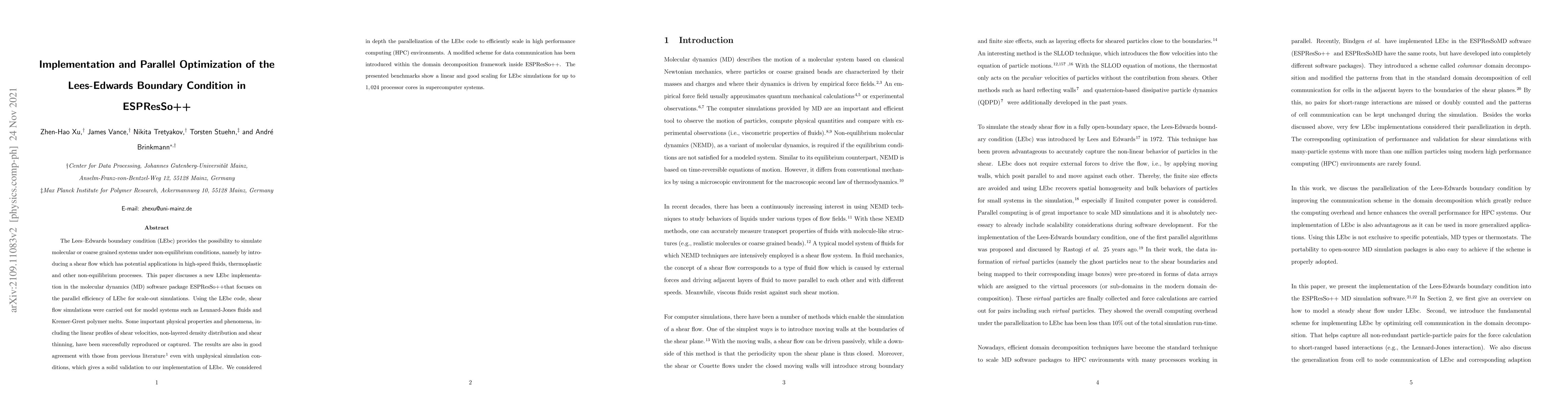 The paper details the implementation and parallel optimization of the Lees-Edwards boundary condition in ESPResSo++ for simulating non-equilibrium systems under shear flow. It validates the code through simulations showing accurate reproduction of physical properties and good parallel scaling up to 1024 processors.