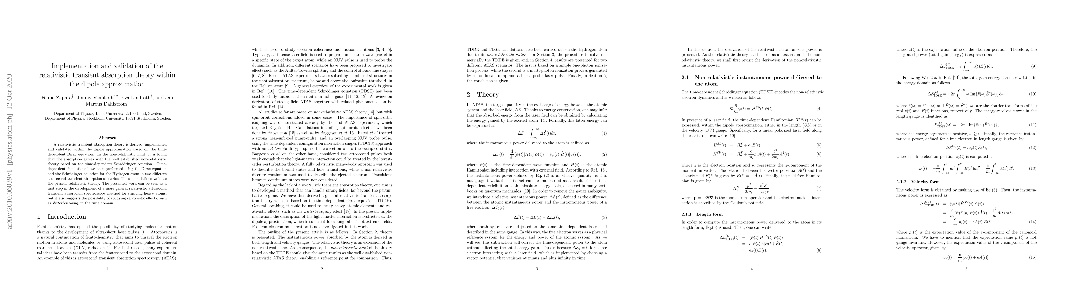 This paper derives, implements, and validates a relativistic transient absorption theory within the dipole approximation using the time-dependent Dirac equation. Simulations for Hydrogen atom scenarios confirm the theory's accuracy, paving the way for future studies of relativistic effects in heavy atoms and phenomena like Zitterbewegung.
