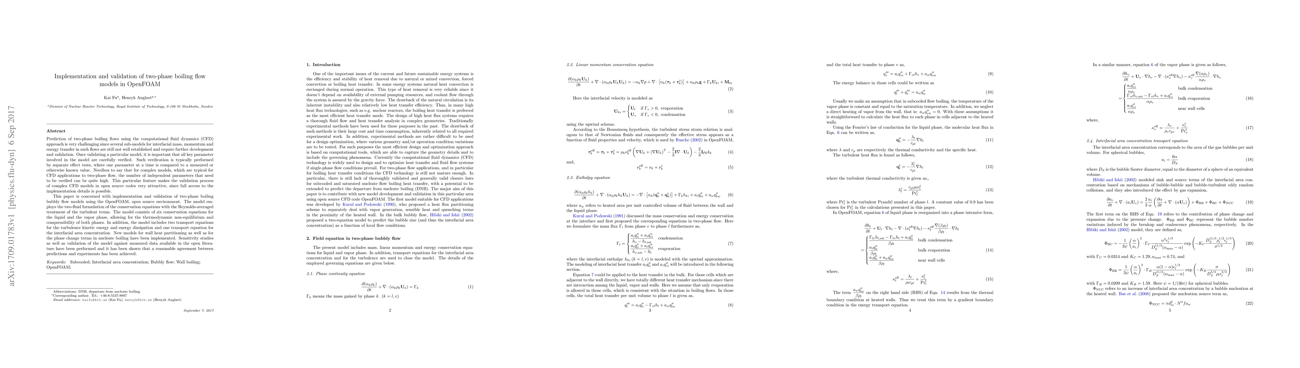 This paper details the implementation and validation of two-phase boiling flow models in the OpenFOAM environment, focusing on the two-fluid formulation for bubbly flow. The model includes six conservation equations for liquid and vapor phases, and new models for wall heat partitioning and nucleate boiling. Validation against experimental data shows reasonable agreement.