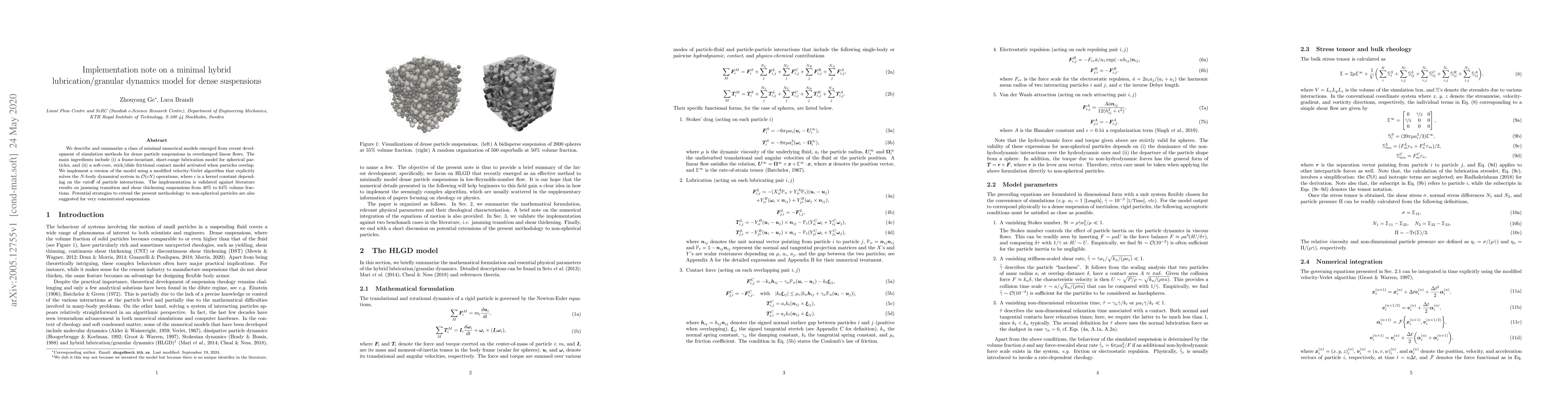 We describe and summarize a class of minimal numerical models emerged from recent development of simulation methods for dense particle suspensions in overdamped linear flows. The main ingredients include (i) a frame-invariant, short-range lubrication model for spherical particles, and (ii) a soft-core, stick/slide frictional contact model activated when particles overlap. We implement a version of the model using a modified velocity-Verlet algorithm that explicitly solves the $N$-body dynamical system in $\mathcal{O}(cN)$ operations, where $c$ is a kernel constant depending on the cutoff of particle interactions. The implementation is validated against literature results on jamming transition and shear thickening suspensions from 40% to 64% volume fractions. Potential strategies to extend the present methodology to non-spherical particles are also suggested for very concentrated suspensions.