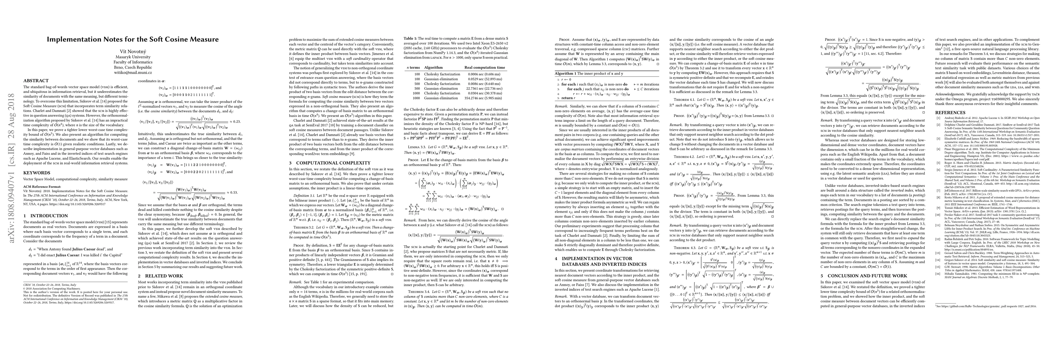 The standard bag-of-words vector space model (VSM) is efficient, and ubiquitous in information retrieval, but it underestimates the similarity of documents with the same meaning, but different terminology. To overcome this limitation, Sidorov et al. proposed the Soft Cosine Measure (SCM) that incorporates term similarity relations. Charlet and Damnati showed that the SCM is highly effective in question answering (QA) systems. However, the orthonormalization algorithm proposed by Sidorov et al. has an impractical time complexity of $\mathcal O(n^4)$, where n is the size of the vocabulary. In this paper, we prove a tighter lower worst-case time complexity bound of $\mathcal O(n^3)$. We also present an algorithm for computing the similarity between documents and we show that its worst-case time complexity is $\mathcal O(1)$ given realistic conditions. Lastly, we describe implementation in general-purpose vector databases such as Annoy, and Faiss and in the inverted indices of text search engines such as Apache Lucene, and ElasticSearch. Our results enable the deployment of the SCM in real-world information retrieval systems.