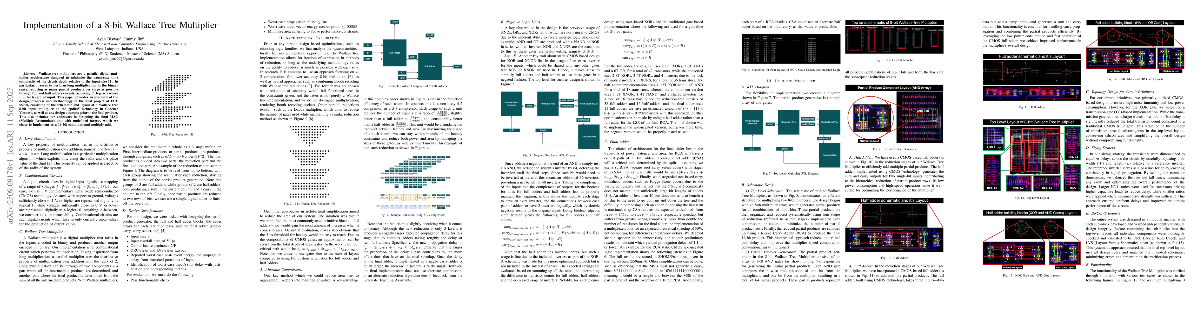 Wallace tree multipliers are a parallel digital multiplier architecture designed to minimize the worst-case time complexity of the circuit depth relative to the input size [1]. In particular, it seeks to perform long multiplication in the binary sense, reducing as many partial products per stage as possible through full and half adders circuits, achieving O(log(n)) where n = bit length of input. This paper provides an overview of the design, progress and methodology in the final project of ECE 55900, consisting of the schematic and layout of a Wallace tree 8-bit input multiplier on the gpdk45 technology in Cadence Virtuoso, as well as any design attempts prior to the final product. This also includes our endeavors in designing the final MAC (Multiply Accumulate) unit with undefined targets, which we chose to implement as a 16 bit combinational multiply-add.